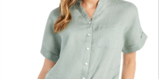 Camisa feminina Charter Club de linho com botões e amarração frontal, verde, tamanho M