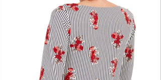Charter Club Top feminino pequeno com listras florais e mangas com babados, branco, tamanho pequeno GG