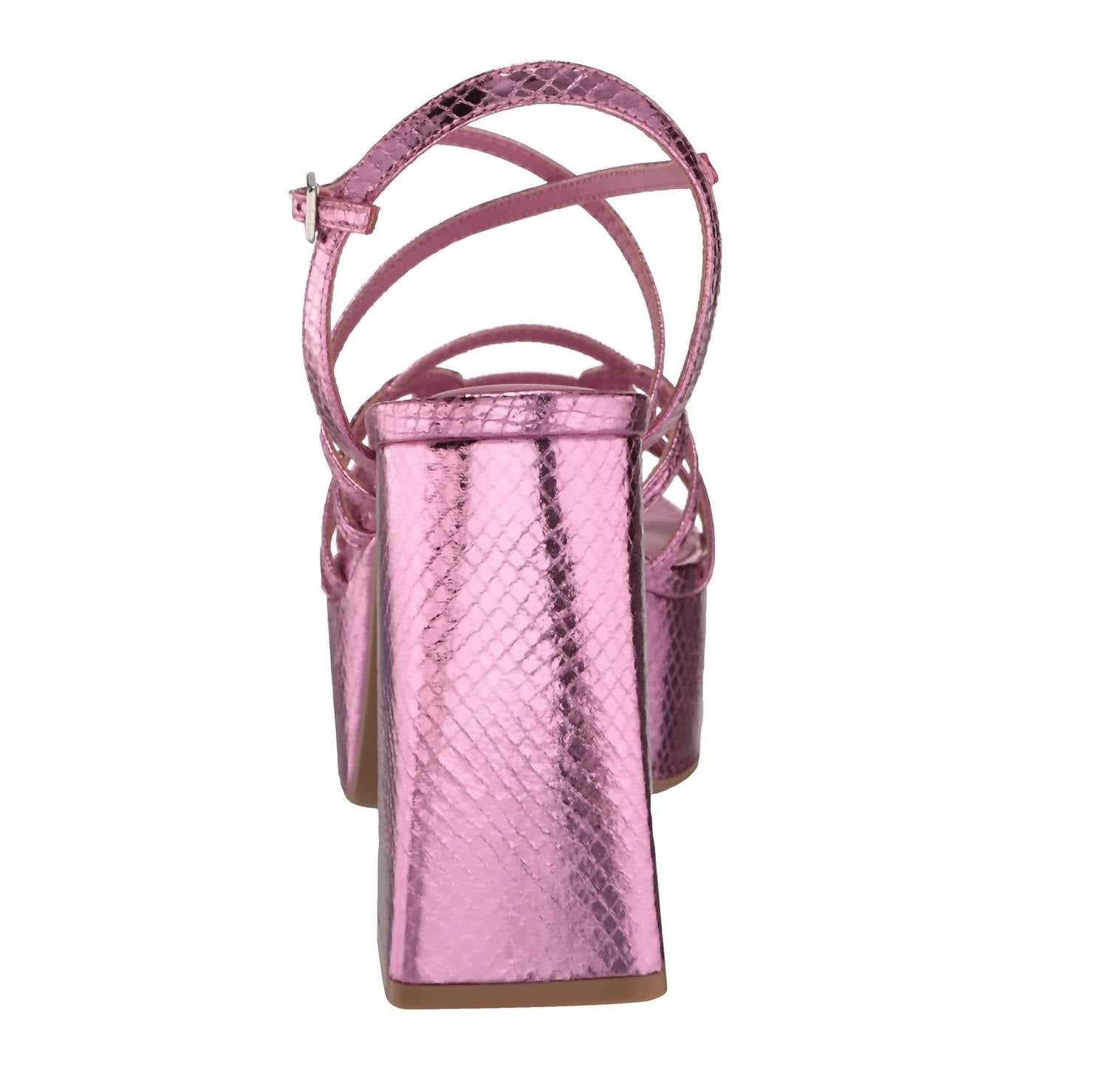 Classicly cute and all-day-wearable. We love this sandal. Introducing the No Prob Heeled Sandal by CHINESE LAUNDRY, a striking addition to your summer wardrobe. This sandal showcases an open toe design with a synthetic upper and features intricately intertwined vamp straps in a metallic faux-snakeskin finish. Highlighted by a 4.5" high tapered block heel and 2" platform for added height, it embodies the trend of quiet luxury. Perfect for a dinner party or Valentine's Day celebration, this attention-stealing sandal is sure to elevate any look with its chic pink hue.