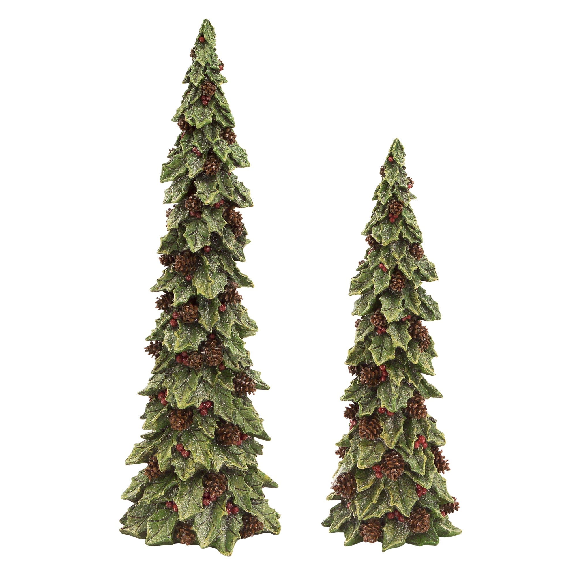 Celebrate the holiday season with timeless elegance by adding the Holly Leaf Holiday Trees with Pinecone Accents to your festive decor. This charming set of two trees comes in varying sizes and features realistic holly leaves paired with beautifully detailed pinecones. Crafted from durable polystone, these tabletop trees will add a touch of natural beauty to your home for seasons to come. Whether displayed on a table or as a floor centerpiece, these holiday trees make a stunning addition to any room or covered outdoor space.
