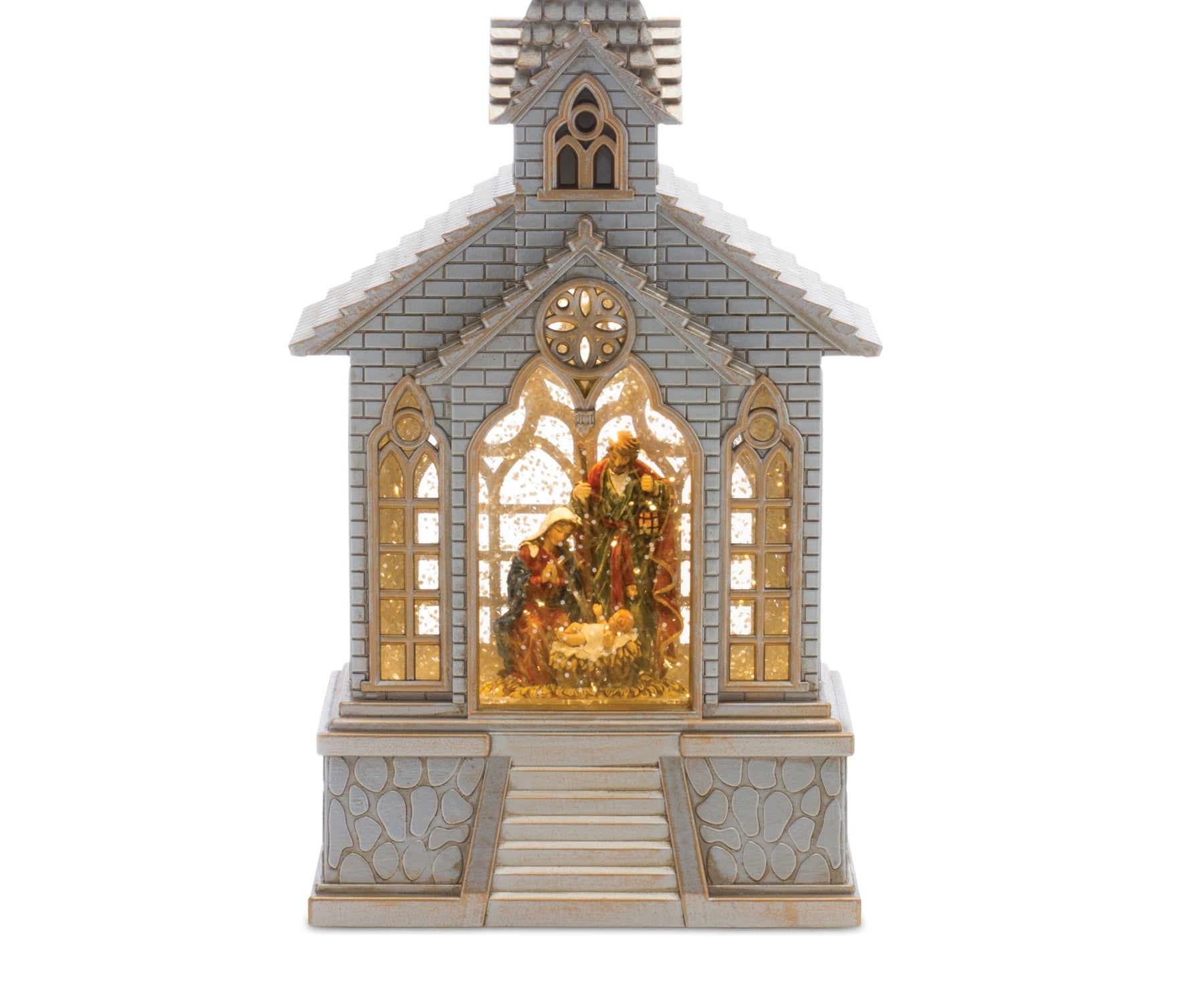 Celebrate the holiday season with the breathtaking LED Snow Globe Church featuring a traditional nativity scene. Standing at 11.25" tall, this elegant lighted snow globe brings warmth and cheer to any home. The serene nativity inside the church is beautifully complemented by sparkling snow, creating a magical atmosphere. Perfect for mantels, shelves, or tabletops, this Christmas snow globe operates with a 6-hour timer for effortless ambiance. Whether powered by 3 AA batteries (not included) or USB cord (included), this elegant decoration will enhance your Christmas celebrations for years to come.