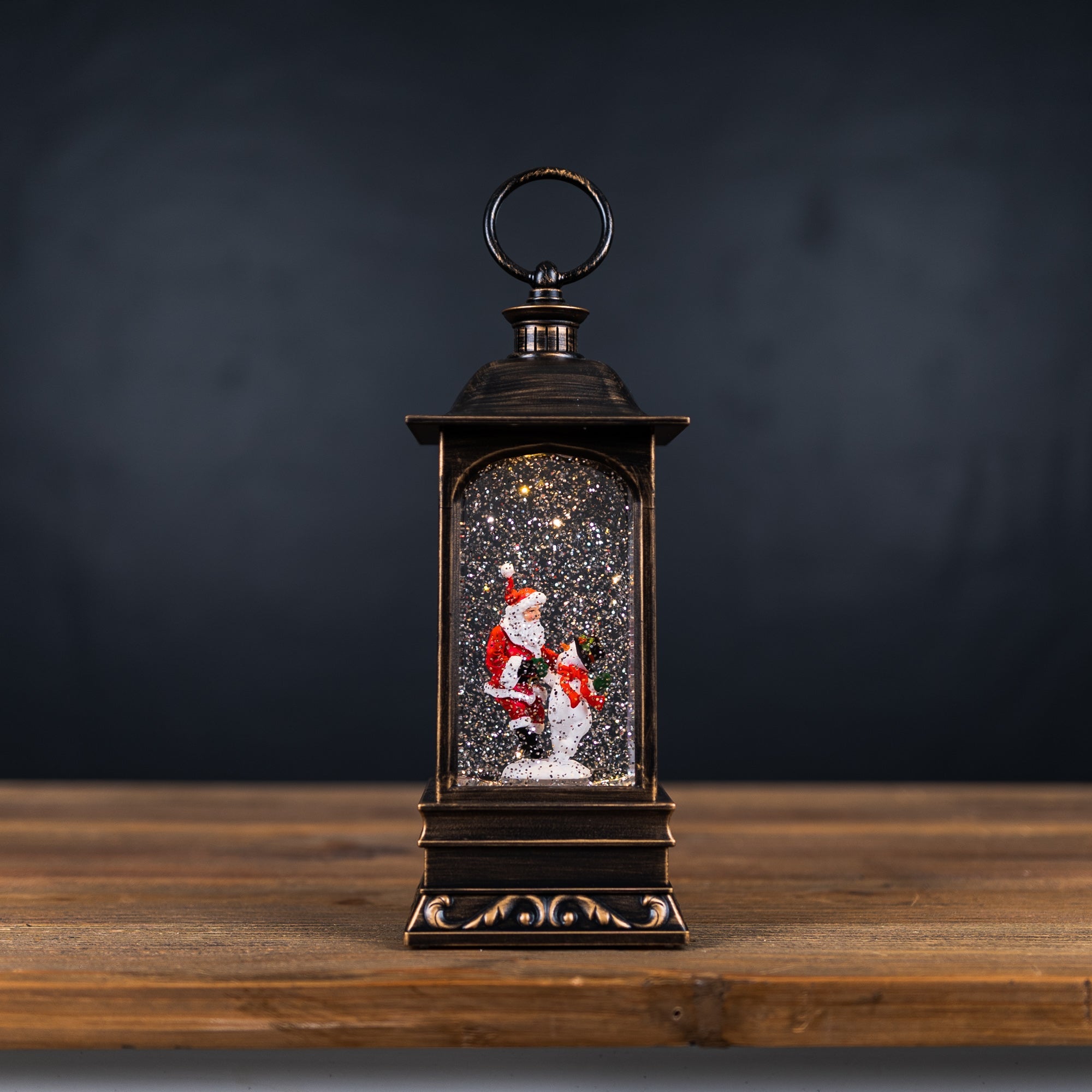 Bring the magic of Christmas to your home with this enchanting LED Snow Globe Lantern featuring Santa and a Snowman! The antique-style bronze lantern houses a mesmerizing winter scene, with swirling glitter that sparkles like freshly fallen snow. Perfect for mantels, shelves, or tabletops, this Christmas snow globe operates with a 6-hour timer for effortless ambiance. Whether powered by 3 AA batteries (not included) or USB cord (included), this elegant decoration will enhance your Christmas celebrations for years to come.
