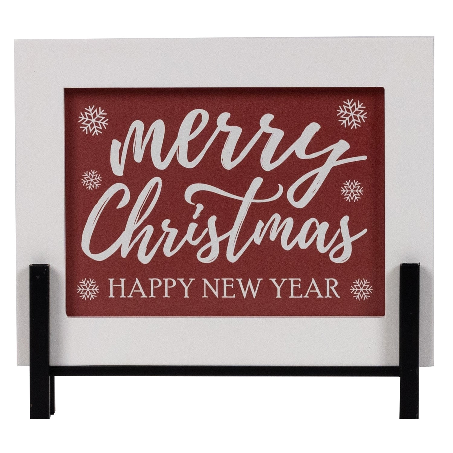 Celebrate the season with the Merry Christmas/Happy New Year Sign, a perfect touch to your holiday decor! Made from durable MDF and fir wood, this charming sign features a festive combination of white and red tones, and a modern stand design. Measuring 8.5"L x 7.75"H, it's ideal for brightening up any room with a warm, cheerful atmosphere. Whether displayed on a mantel, shelf, or wall, this sign will bring joy to your home all season long. Spread the holiday cheer today with this beautiful piece!