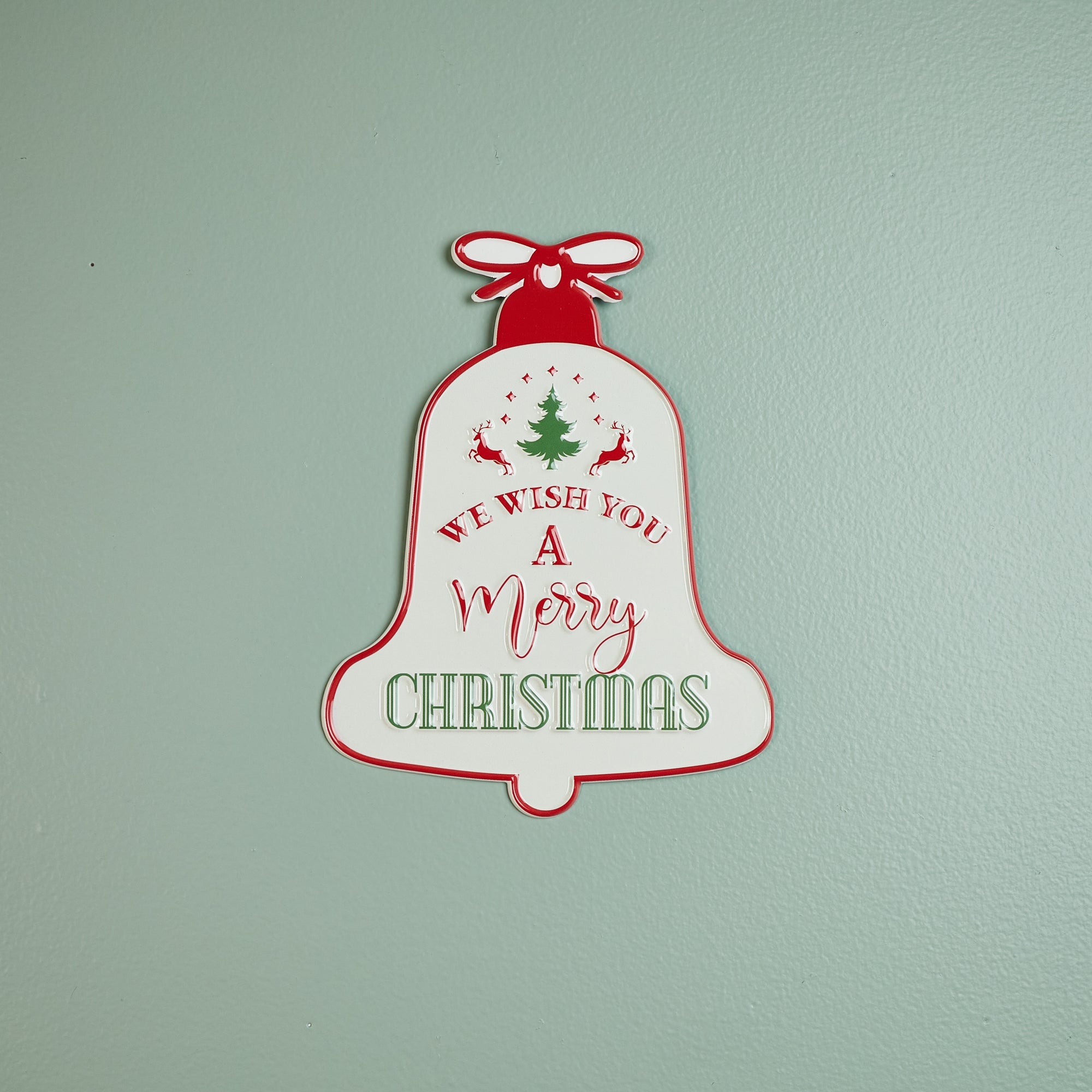 Celebrate the season with this Metal Merry Christmas Bell Sign, featuring a traditional bell shape and festive red and green tones. The sign displays the beloved sentiment "We Wish You a Merry Christmas" along with charming pine tree and deer accents. The piece comes with a sawtooth hook on the back for securing it safely to the wall of your home. This sign is perfect for adding a touch of holiday cheer to your living room or entryway, or it makes a thoughtful gift for friends and family.