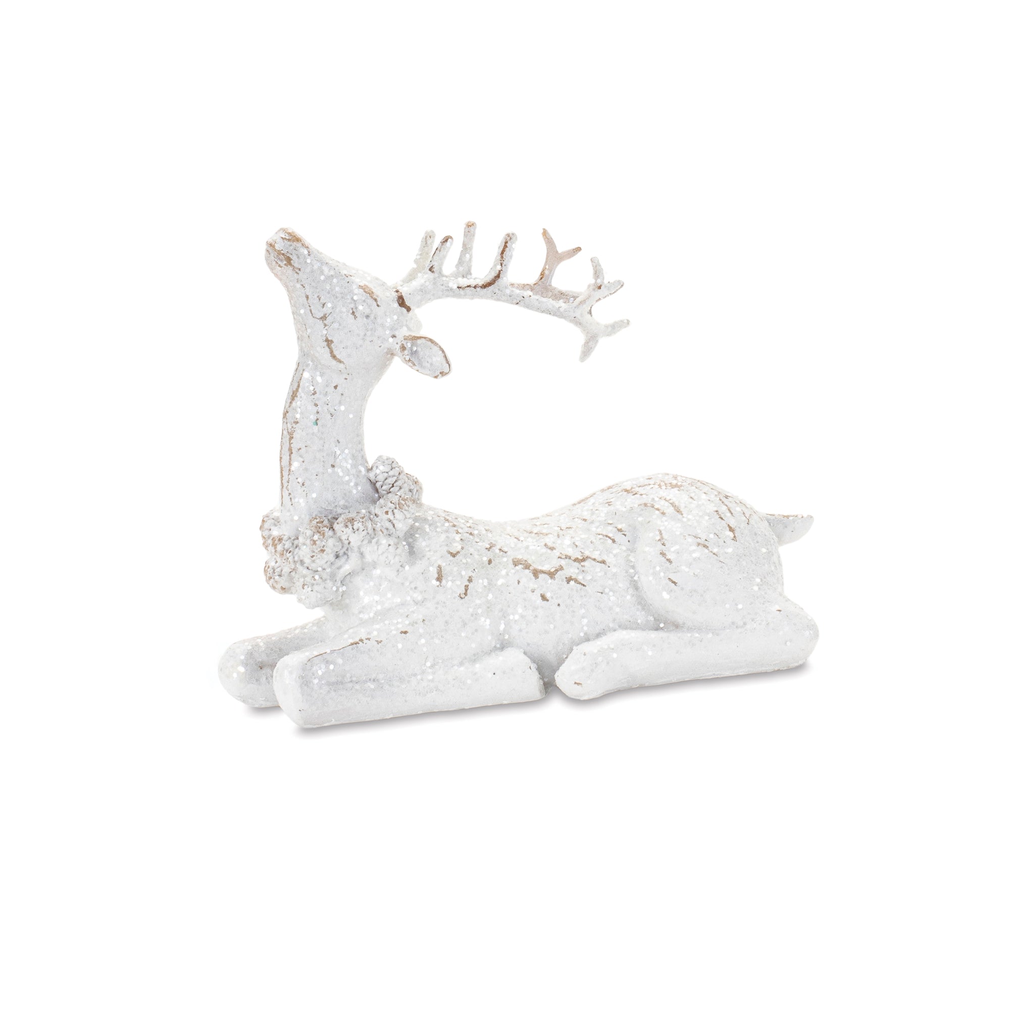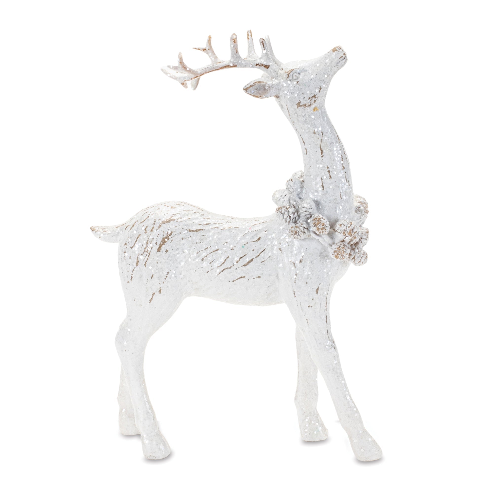 Enhance your holiday decor with this Winter Deer Figurine Set, featuring wintry white and grey tones with a trendy whitewashed finish. These rustic deer characters are adorned with charming pinecone wreath accents, adding a natural and festive touch to your seasonal displays. The set includes two assorted designs, for a beautifully varied arrangement. Perfect for displaying on a tabletop, shelf, or mantle, these deer figurines pair effortlessly with a holiday Santa statue, seasonal floral arrangement, or a set of pine trees, bringing warmth and elegance to your festive decor.