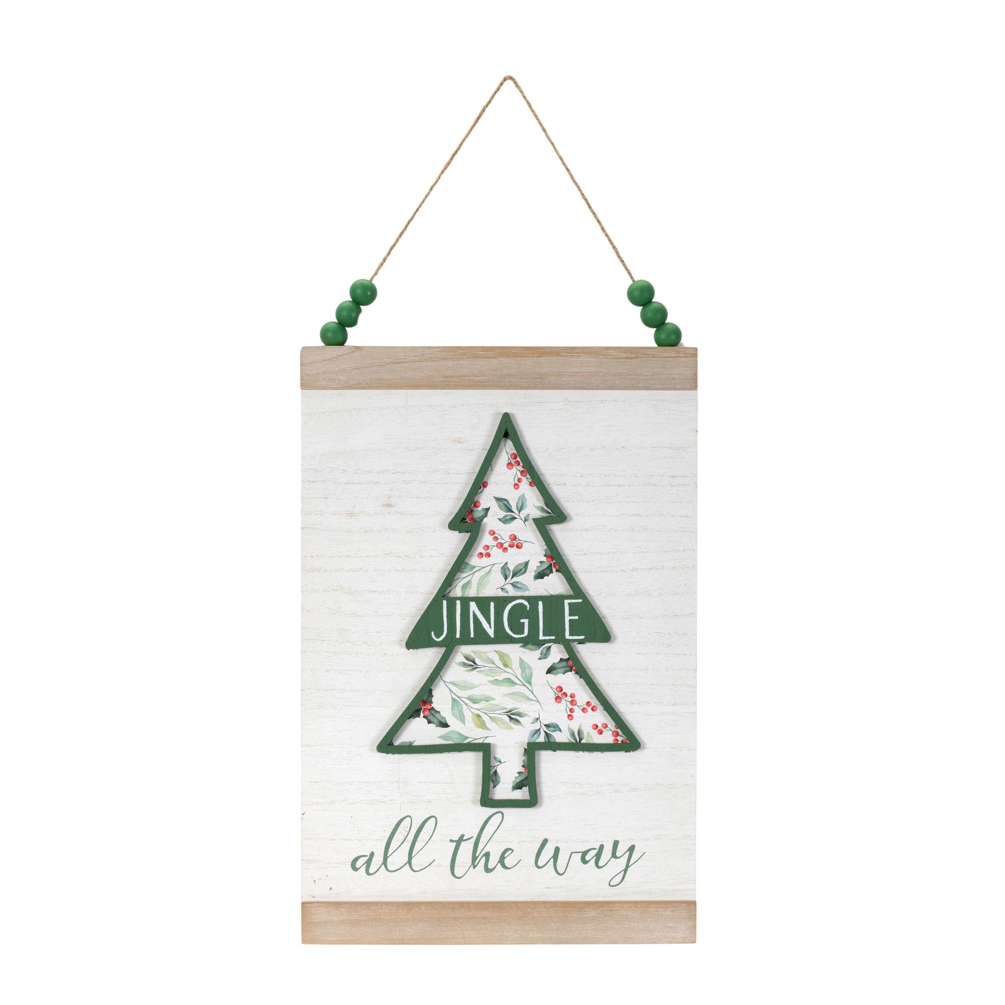 Add a festive touch to your home with the Wood Beaded Merry Christmas Banner Set. Featuring classic red and green tones, these banners display beloved Christmas sentiments, "Merry Christmas" and "Jingle All the Way," paired with traditional pine tree shapes and modern winter foliage prints. The rustic natural wood grain accents and wood beaded twine hangers complete the look, making these banners the perfect addition to your living room or entryway. Each piece comes with a string hanger on the top for securing it safely to the walls of your home. Sold in a set of two assorted pieces, these banners also make a thoughtful gift for loved ones this holiday season.