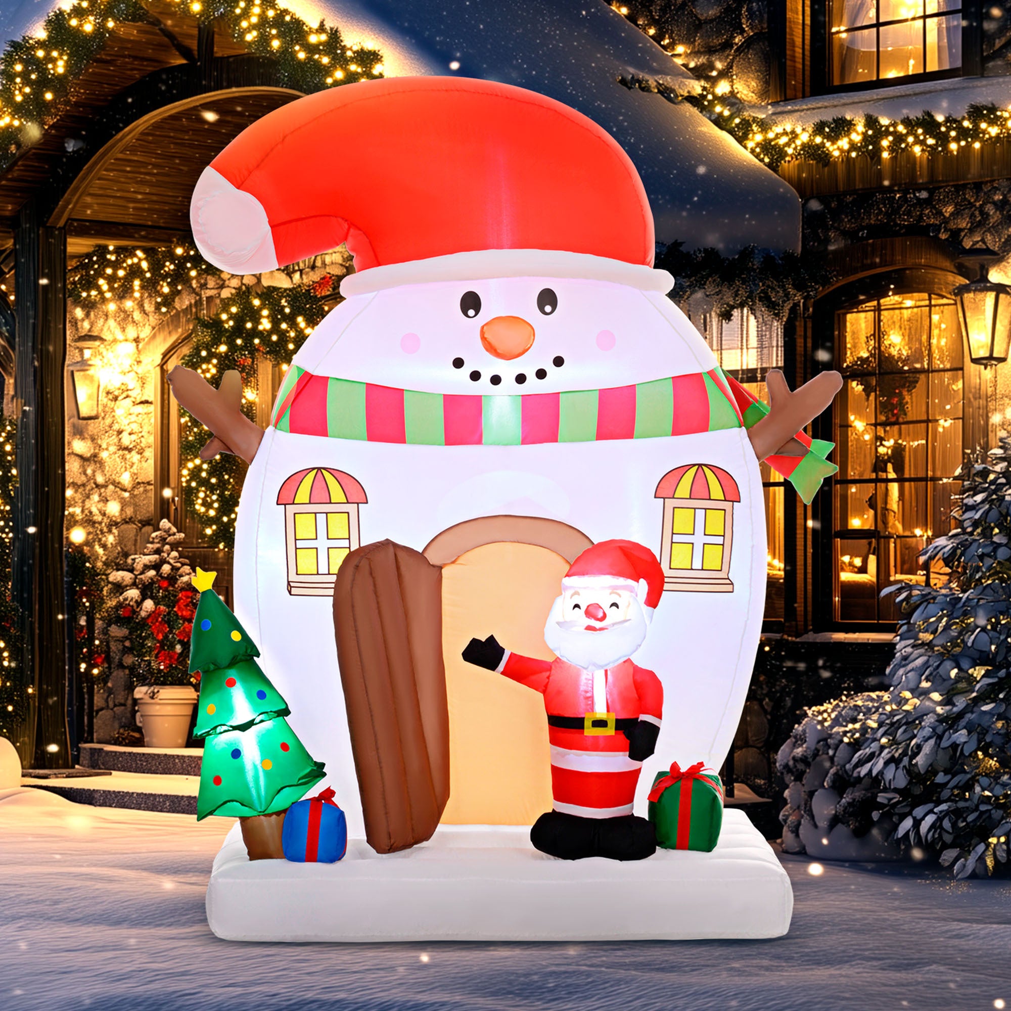Elevate your holiday décor with this 7.5 ft festive inflatable, featuring Santa Claus welcoming you to his snowman house, surrounded by a Christmas tree and gift boxes. Perfect for creating a magical outdoor holiday display that delights family, friends, and neighbors alike.