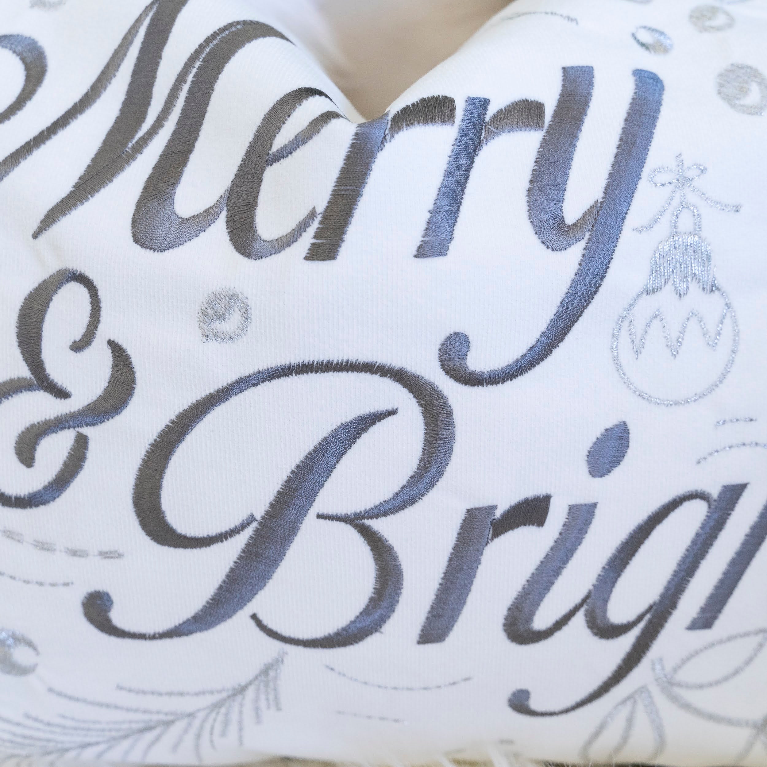 Add a touch of festive elegance to your home with this rectangular 14x20" lumbar pillow, featuring the “Merry & Bright” script embroidered in silver, accented with delicate ornaments and pine motifs. Crafted from soft velvet, it offers cozy comfort and a refined seasonal look that complements modern or classic holiday decor.