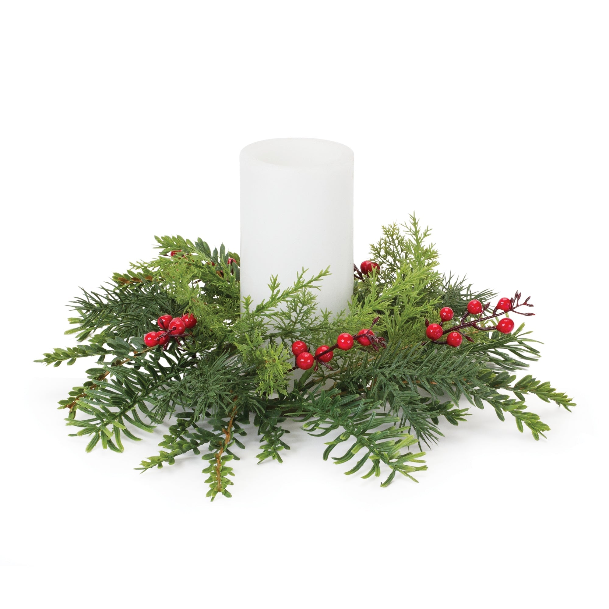 Add a touch of festive cheer to your home with this Pine Berry Candle Ring. Designed to fit a 4" candle, this 14" wreath blends vibrant green and red tones with charming berry accents, creating the perfect holiday centerpiece. Crafted from durable plastic with a natural grapevine twig base, it's ideal for decorating your front door, mantel, or any indoor space. Welcome the season in style and enhance your holiday decor with this timeless piece that will shine year after year. Measures 14 inches across when branches are extended and fluffed.