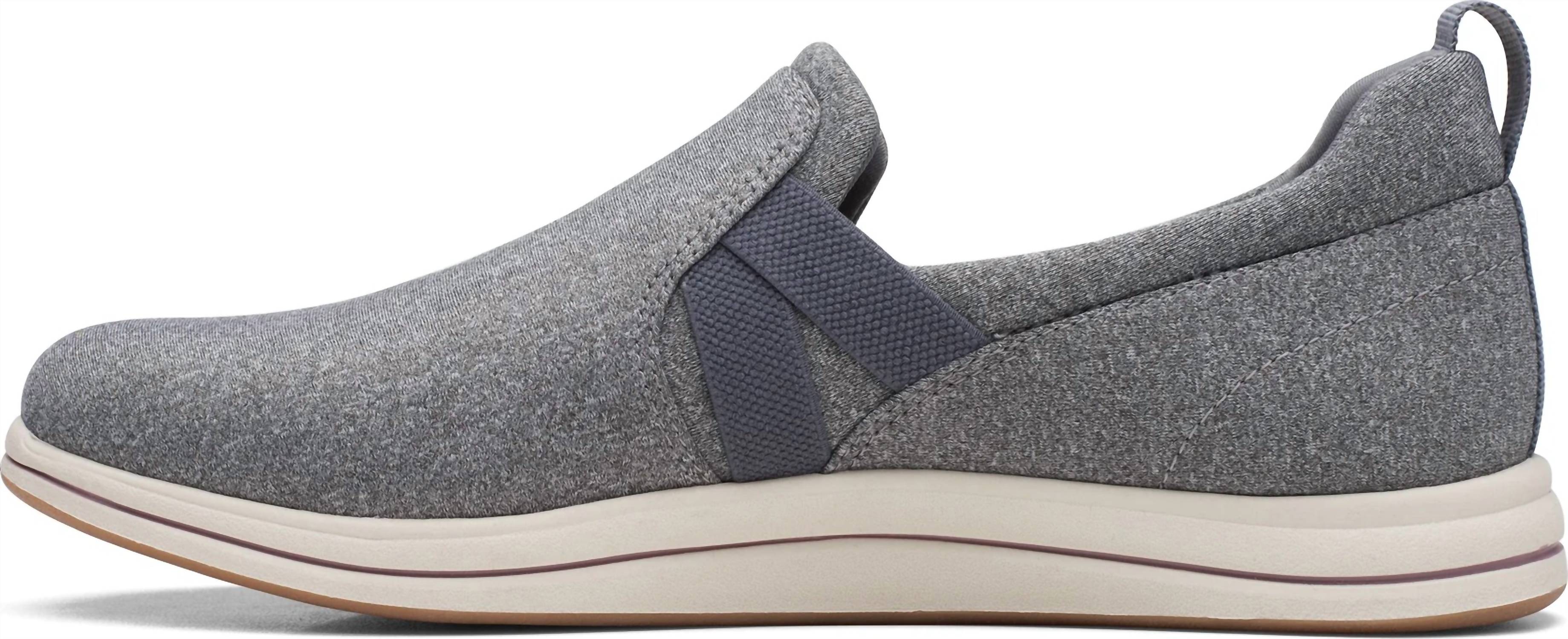 Step into comfort with the Women's Breeze Bali Slip-On Shoes by Clarks, tailored for minimalist elegance in dark grey. These shoes feature a soft fabric upper with easy on/off stretch panels for a secure yet flexible fit. Enjoy the 2mm Cushion Soft™ PU foam footbed, which is removable and machine washable for convenience. The durable, slip-resistant TR outsole and flat 25mm heel make these perfect for spring dinner parties.