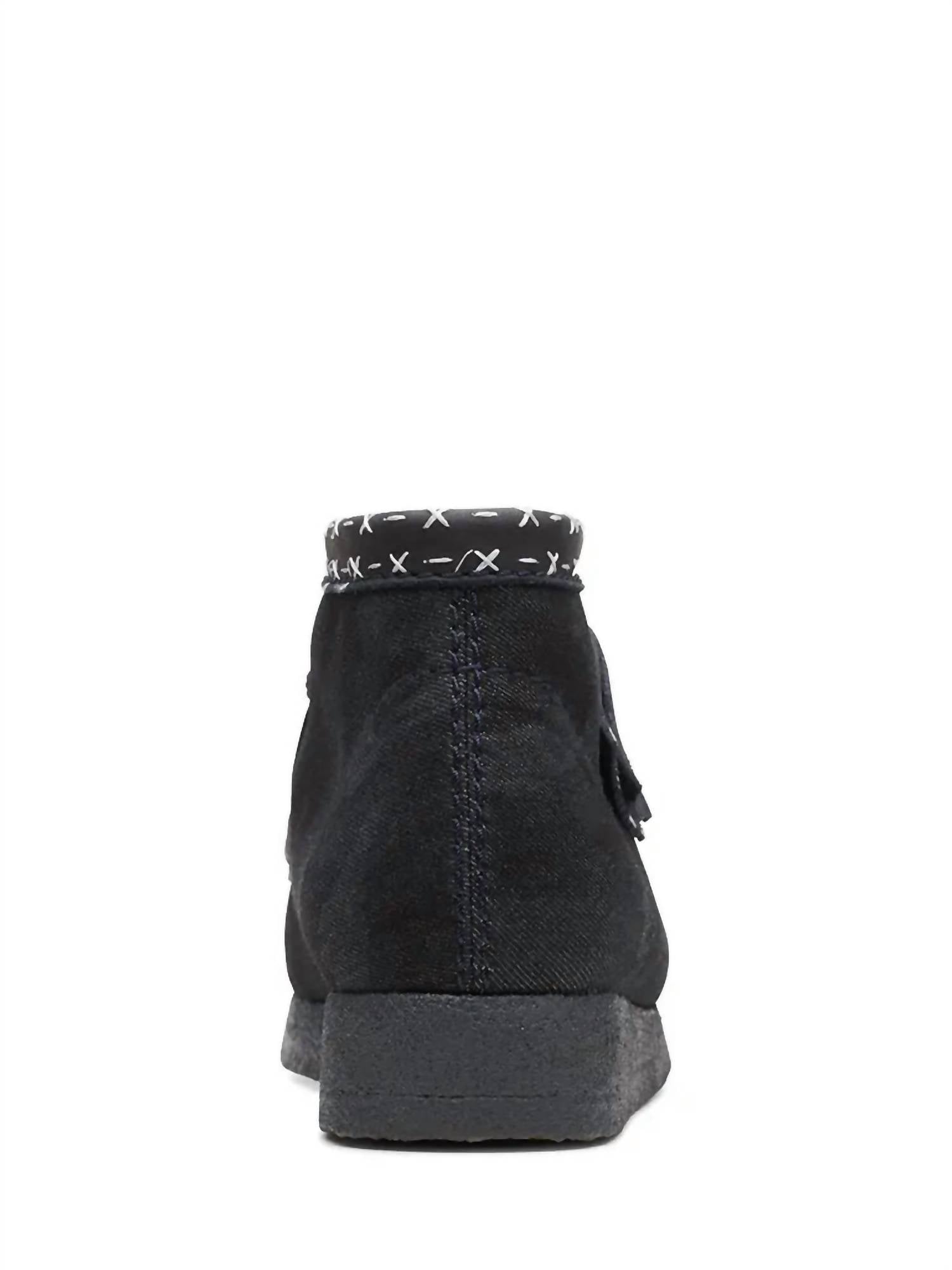 Meet the Men's Wallabee Boot by Clarks, a stylish choice for the spring season that’s perfect for a dinner party. This reimagined classic in Denim Blue features an upper made from a blend of textile and leather with eye-catching contrasting topstitching. Comfort is assured with its flexible and lightweight crepe sole, while the lace fastening ensures a secure fit. Enjoy the round toe design and minimalist trend this timeless boot offers.