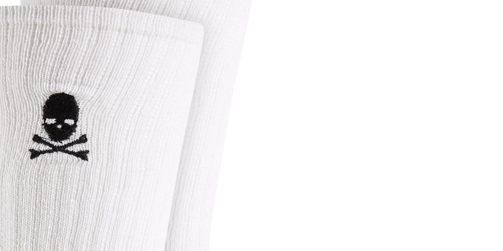 Estampada com um desenho minimalista de caveira e ossos cruzados que se esconde sob as calças | As meias cano alto da Club Room permitem que você atravesse o dia com um toque secreto de ousadia. | Desenhos de caveira e ossos cruzados | | Algodão/poliéster/elastano | Lavável à máquina | Importado