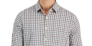 Camisa xadrez masculina Club Room com botões e gola alta, bege, tamanho médio