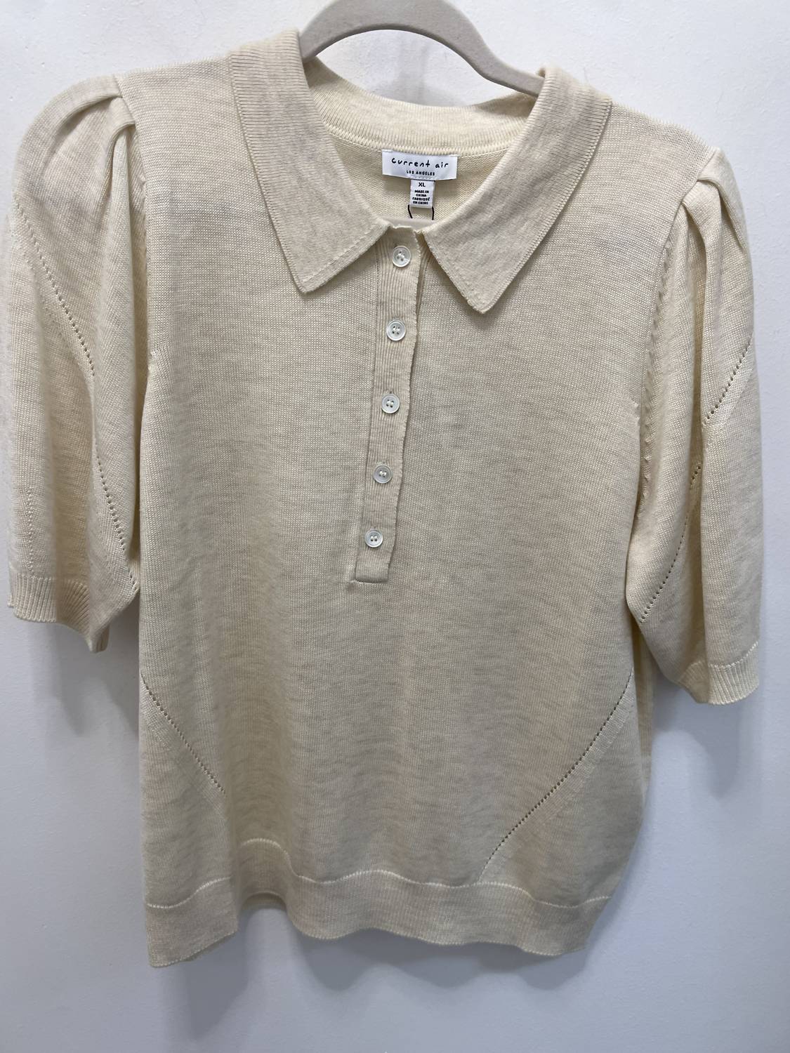 Discover the Short Sleeve Knit Polo Top by Current Air, a minimalist piece perfect for elevating your spring wardrobe. This women's blouse, available in a solid ivory color, features a classic collar and button closure, offering a chic yet relaxed look. Whether for a casual outing or a holiday party, this versatile top makes a stylish statement.