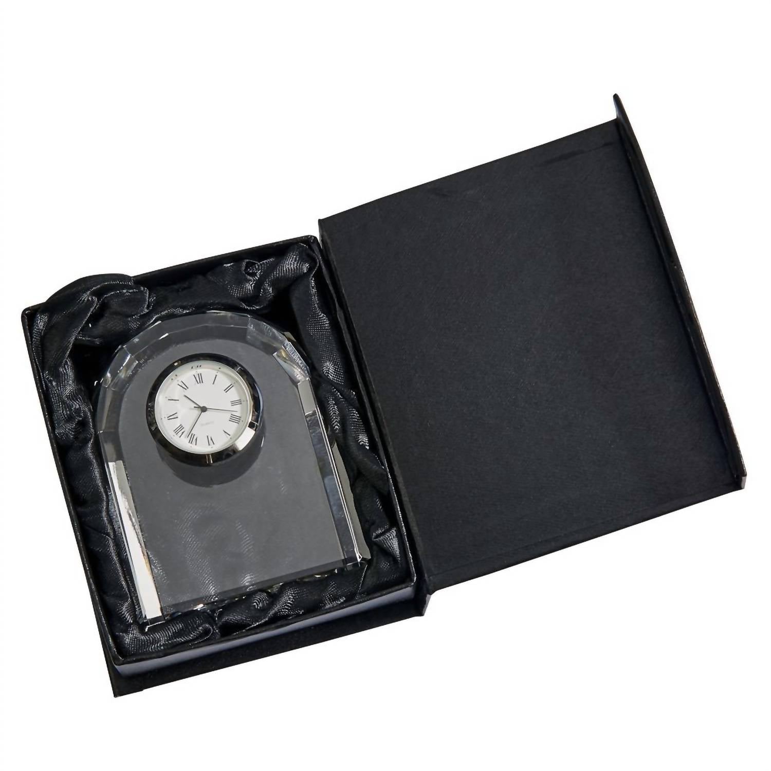 Eleve seu espaço com o Relógio de Cristal Óptico em Arco da Creative Gifts International, uma mistura marcante de clareza e elegância. Este relógio elegante tem 9,5 cm de altura e 8,2 cm de largura, feito de cristal ótico sem chumbo, perfeito para gravação a laser. Com uma luneta cromada que abriga um relógio de 3,8 cm de diâmetro com mostrador branco, o design é complementado por ponteiros pretos e algarismos romanos para um visual atemporal. Suas facetas de cristal que capturam a luz adicionam um toque de luxo, e ele é portátil, graças à sua praticidade de bateria – bateria do tamanho de um relógio incluída.