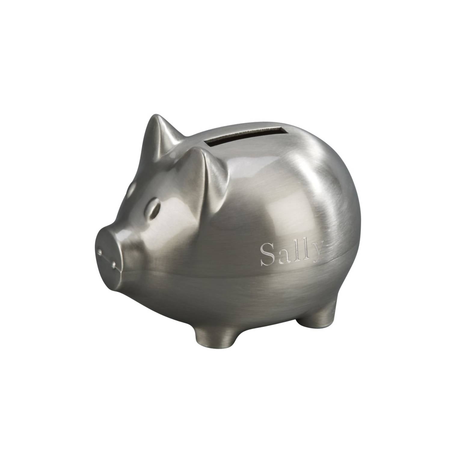 Este cofrinho de metal tem um acabamento em estanho escovado que não mancha, então você não precisará gastar tempo polindo-o; em vez disso, poderá se dedicar a contar seu dinheiro. O cofrinho tem bastante espaço para gravar um nome, data ou mensagem especial para qualquer ocasião. O cofrinho mede 7,6 cm de altura x 6,9 cm de largura x 9,4 cm de comprimento. O compartimento para inserir dinheiro fica na parte superior das costas do porquinho e você vai adorar os detalhes como o focinho, as orelhas e os olhos. Caixa de presente branca.