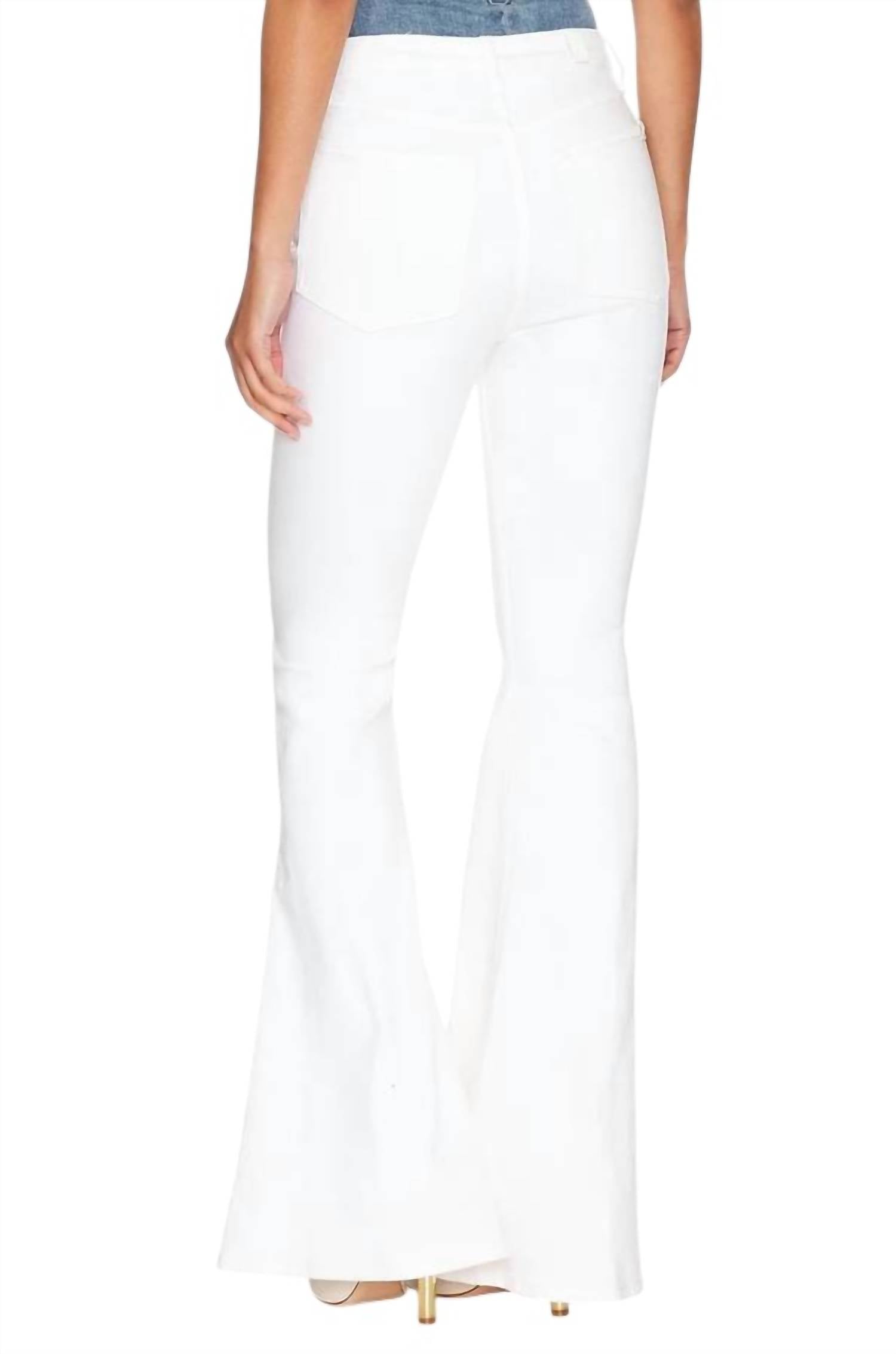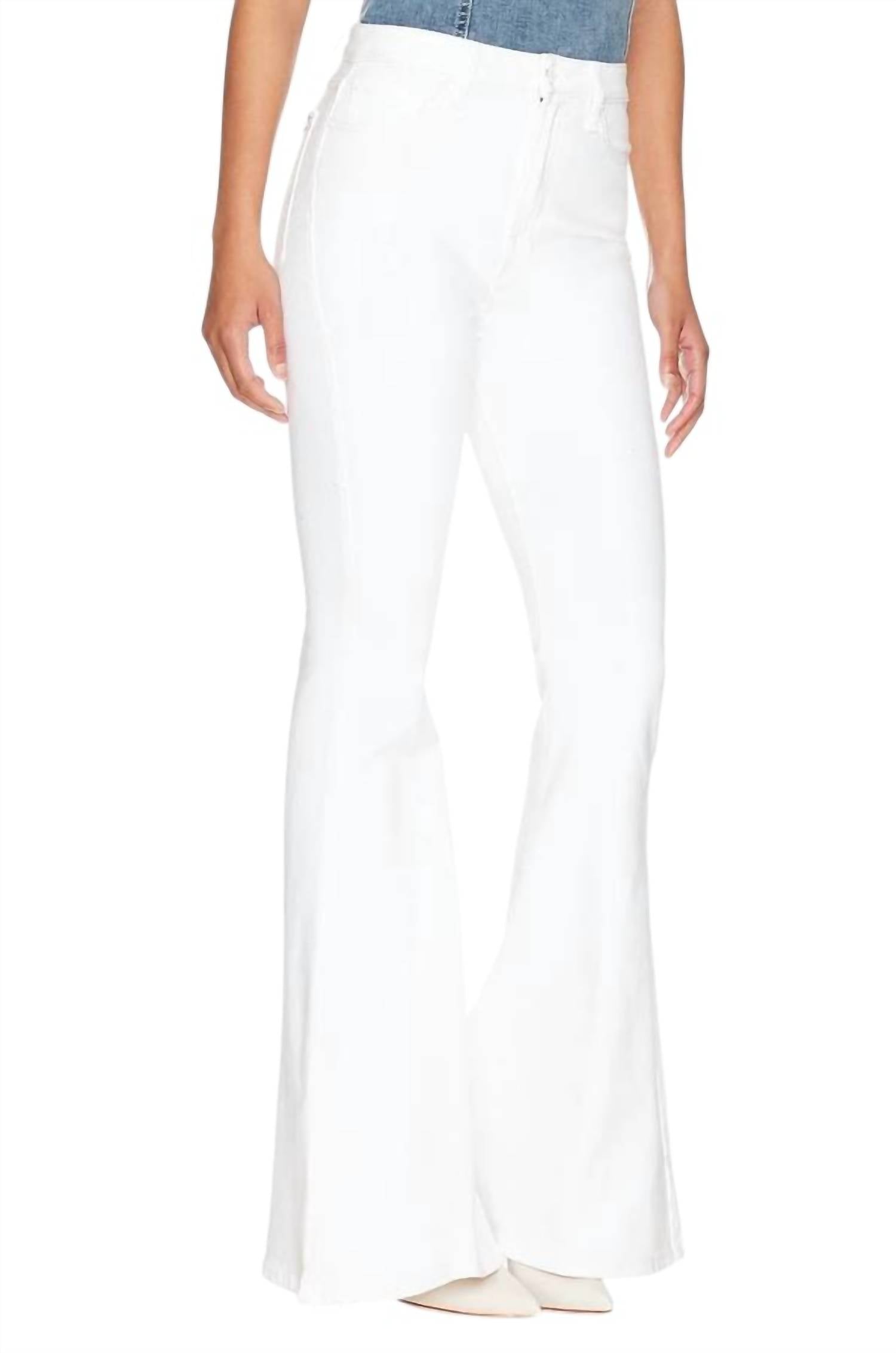 Calça Jeans Megflare 7 For All Mankind em Branco Puro. Esta calça jeans branca brilhante, de cintura ultra alta, impressiona. Com uma silhueta inspirada nos anos 70, esta calça é ajustada nos quadris e coxas, e o comprimento alongado das pernas resulta em um corte ousado. O jeans branco puro, com elasticidade média, será o seu novo favorito para o ano todo. 98% algodão, 2% elastano. Lavável à máquina.