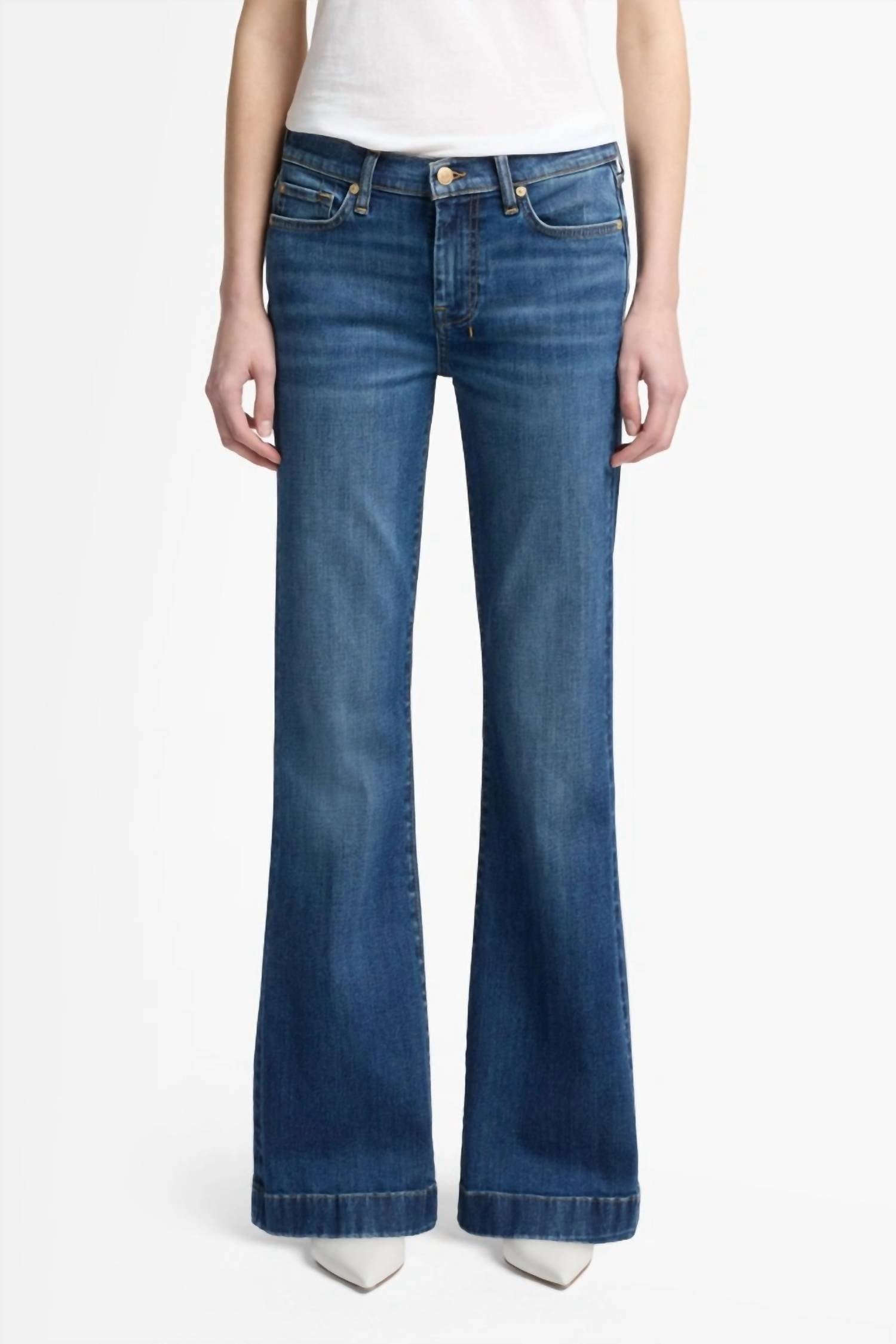 Elevate your wardrobe with the Tailorless Dojo Mid Waist Flared Jeans by 7 For All Mankind, perfect for stylish fall outings. Crafted from solid medium wash denim, these mid-blue jeans feature a slim fit and flared leg style. With a mid-rise at 9 2/8" and a 32" inseam, they include functional pockets and a convenient button closure. Easy to care for, they are machine washable and can be tumble dried, making them ideal for travel and Thanksgiving gatherings.