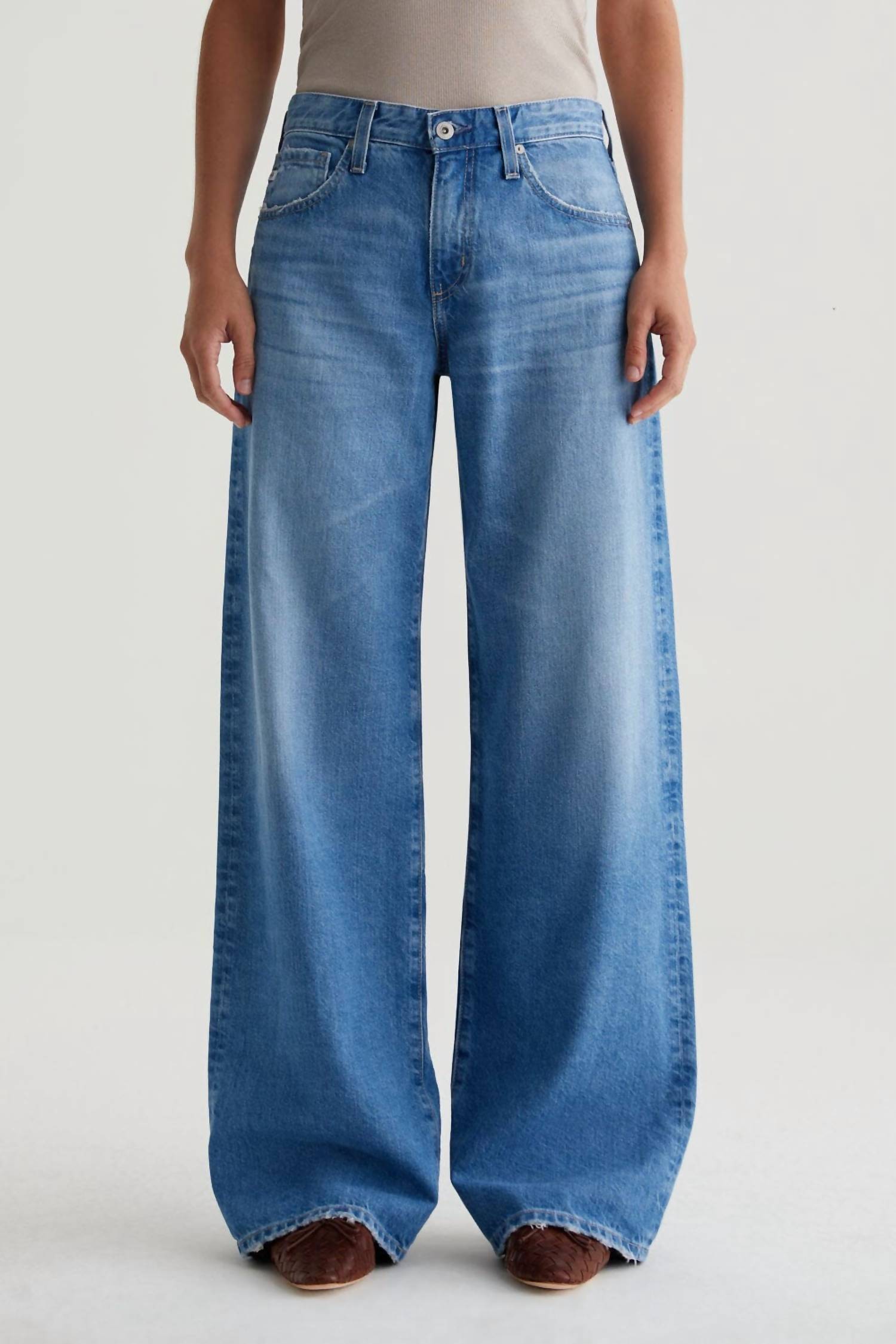 Just as cute as they are comfortable. Discover the Adria Low-Rise Wide Leg Jeans by AG Jeans, tailored for a relaxed, slouchy fit. These jeans are made from Drapey Rigid Denim, a 12 oz. cotton blend consisting of 82% cotton and 18% lyocell, providing a soft, non-stretch feel. The medium wash gives a bright-blue hue with subtle wear at the pockets and hems, while the zip closure ensures a secure fit. Care instructions recommend machine wash. This style sports a 9 1/2" front rise, with a 22" knee opening, 21" bottom opening, and a 32" inseam, perfect for a laid-back spring look suitable for music festivals.