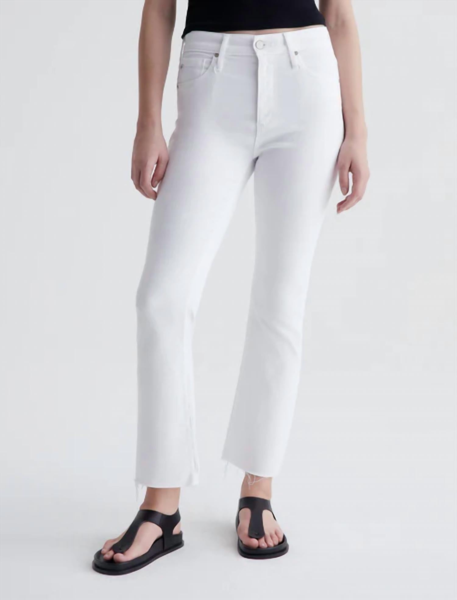 A calça jeans Farrah Boot Crop é um modelo bootcut cropped de cintura alta em denim branco brilhante. O modelo tem um corte skinny na perna antes de abrir em uma bainha crua sutilmente alargada. Confeccionada com o exclusivo AG Cloud Soft Denim™ da AG, esta calça jeans bootcut feminina é confeccionada em Hyper-Soft Stretch Denim de 9,7 oz, um tecido de sarja à esquerda que permite que os fios relaxem e se desfiem suavemente, proporcionando um toque macio e aveludado. Ela foi desenvolvida para ficar ainda mais macia conforme você a veste. A construção superelástica oferece maior conforto e recuperação aprimorada. AG Cloud Soft Denim™, Hyper-Soft Stretch Denim, 9,7 oz. 56% Algodão, 19% Modal, 18% Lyocell, 6% Poliéster, 1% Elastano. A modelo veste tamanho 25. Altura da frente: 25 cm. Abertura do joelho: 35 cm. Abertura da perna: 47 cm. Costura interna: 71 cm.