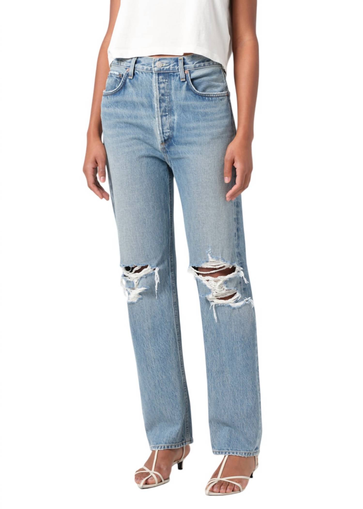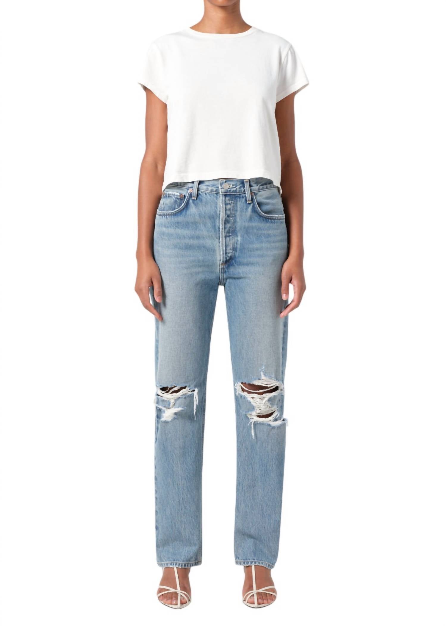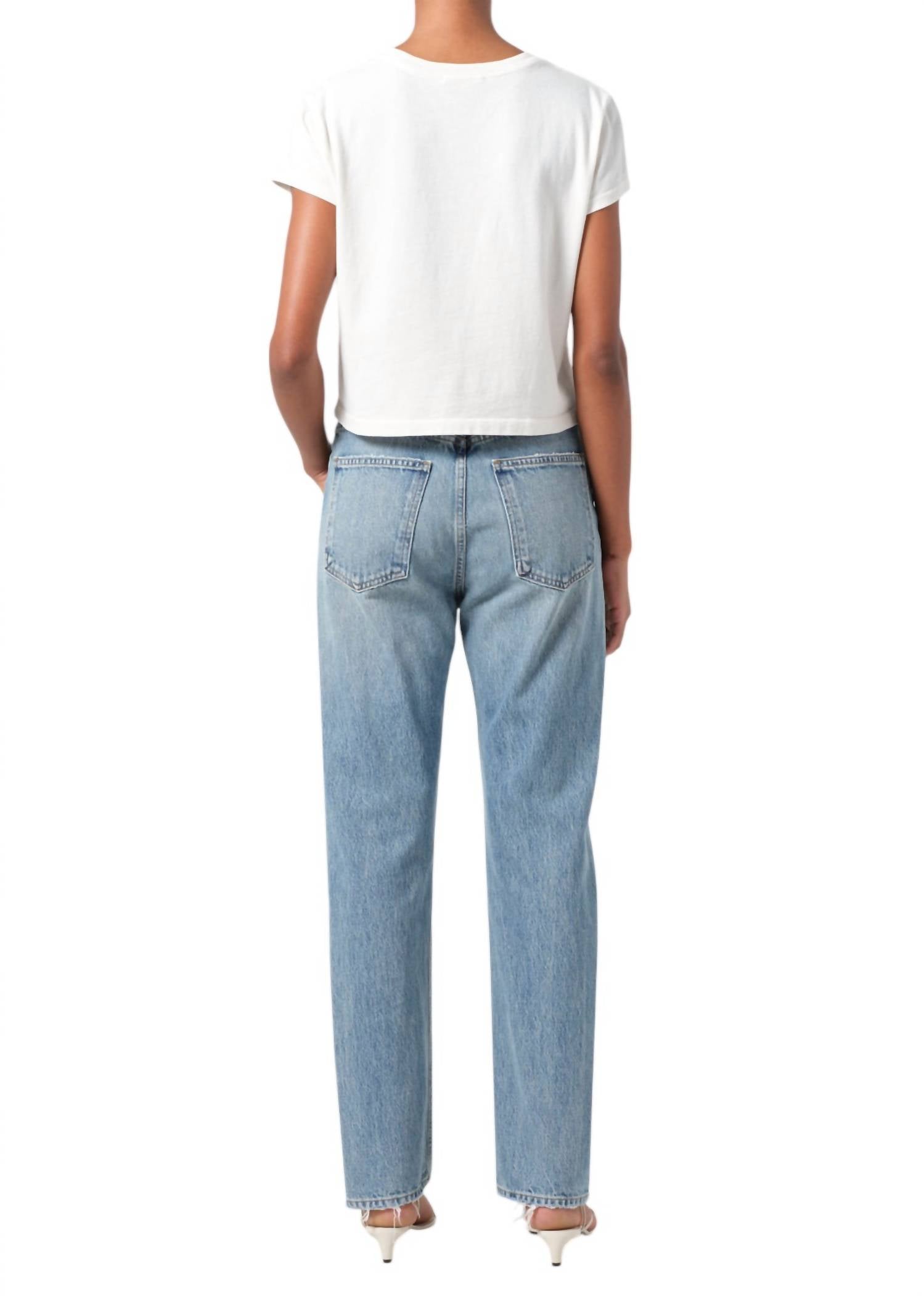 Apresentamos a calça jeans 90's Pinch Waist da AGOLDE, uma peça essencial e atemporal no estilo Backdrop índigo médio com acabamento desfiado nos joelhos. Confeccionada em 100% algodão regenerativo, esta peça promete ficar mais macia a cada uso. Possui cintura alta com 32 cm de comprimento e 75 cm de comprimento total, aprimorando seu caimento reto clássico e fácil de usar. Fabricada nos EUA, esta calça jeans possui fecho de botão confiável e pode ser lavada na máquina para um cuidado sem esforço.