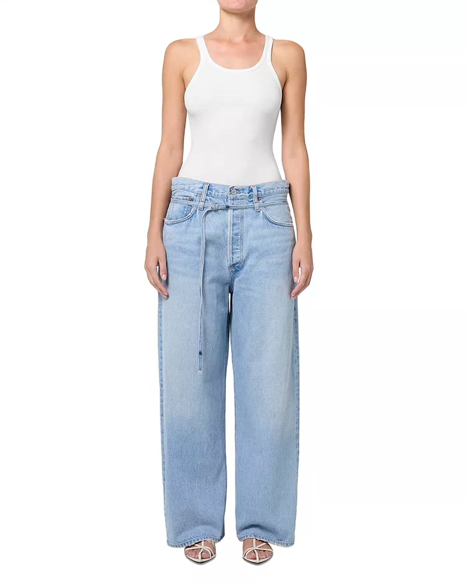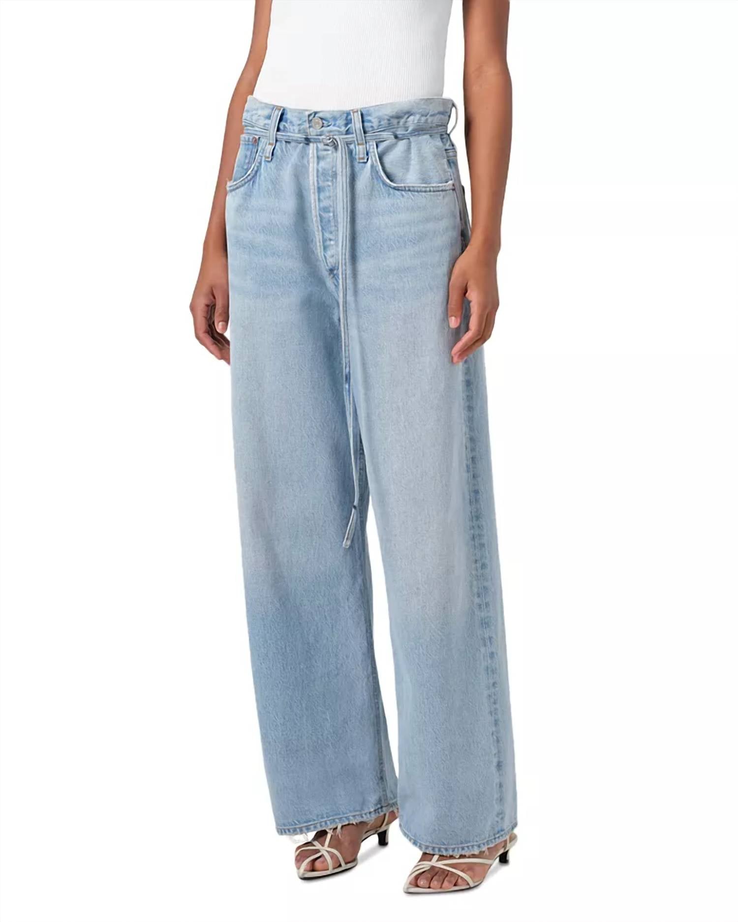 Pair these wide leg jeans with mules, slides or your favorite strappy sandals. Introducing the Emmi High Rise Wide Leg Jeans by AGOLDE, a perfect blend of classic 90s fashion and modern sophistication. These women's jeans feature a high-rise fit with wide leg styling, crafted from solid light wash denim. They include functional pockets and a zip closure for convenience. Designed for both comfort and style, these jeans offer a slim fit and are easy to care for with machine wash and tumble dry instructions.