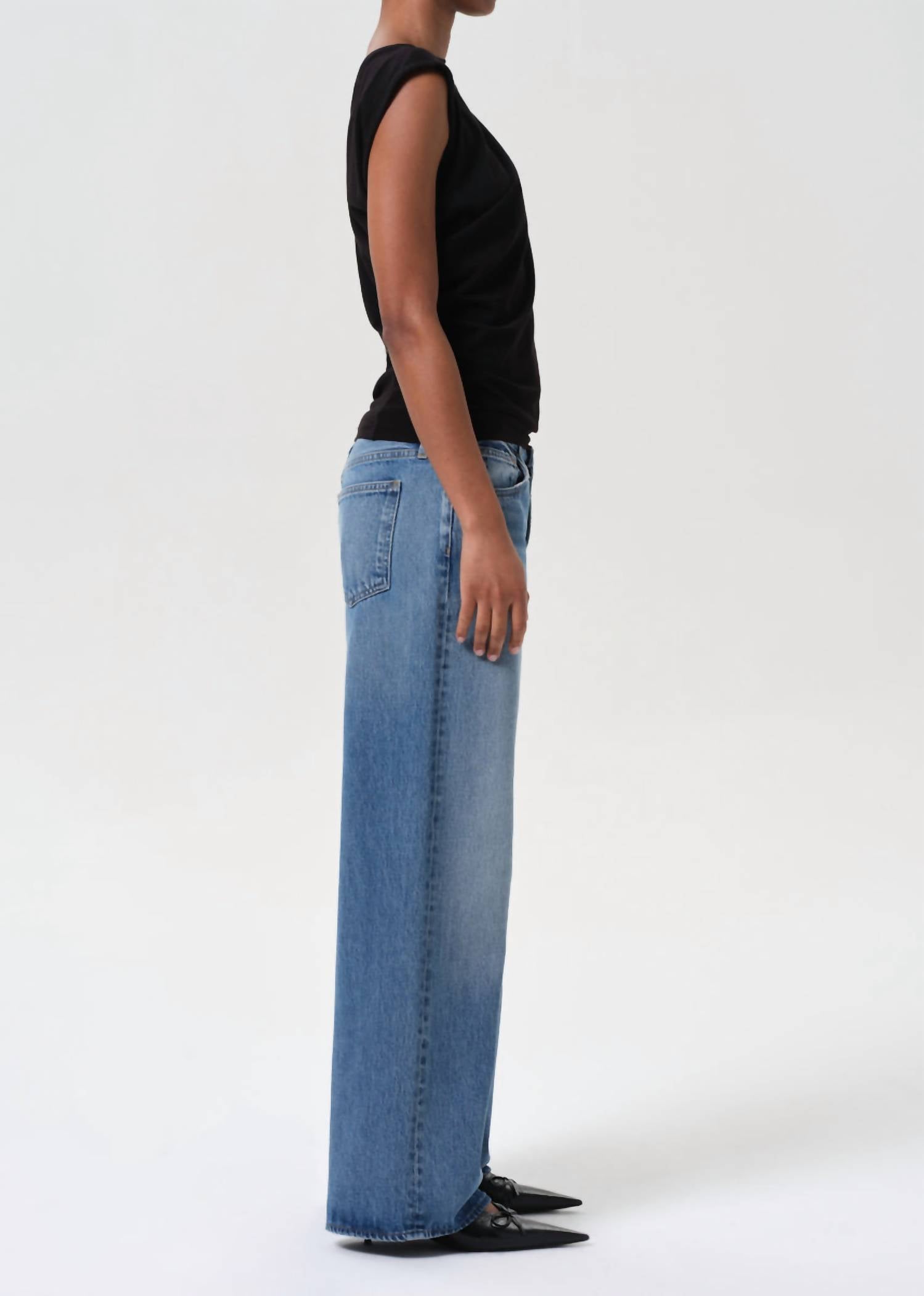 Meet the Keira Wide Leg Jean by AGOLDE, featuring a relaxed fit with a low-rise waist and exaggerated full-length wide leg for a contemporary silhouette. Made from rigid regenerative cotton denim, these jeans come in a solid 'Downtown' medium wash that's perfect for any spring occasion, such as a dinner party. Closure: Button closure. Care: Machine wash and tumble dry.