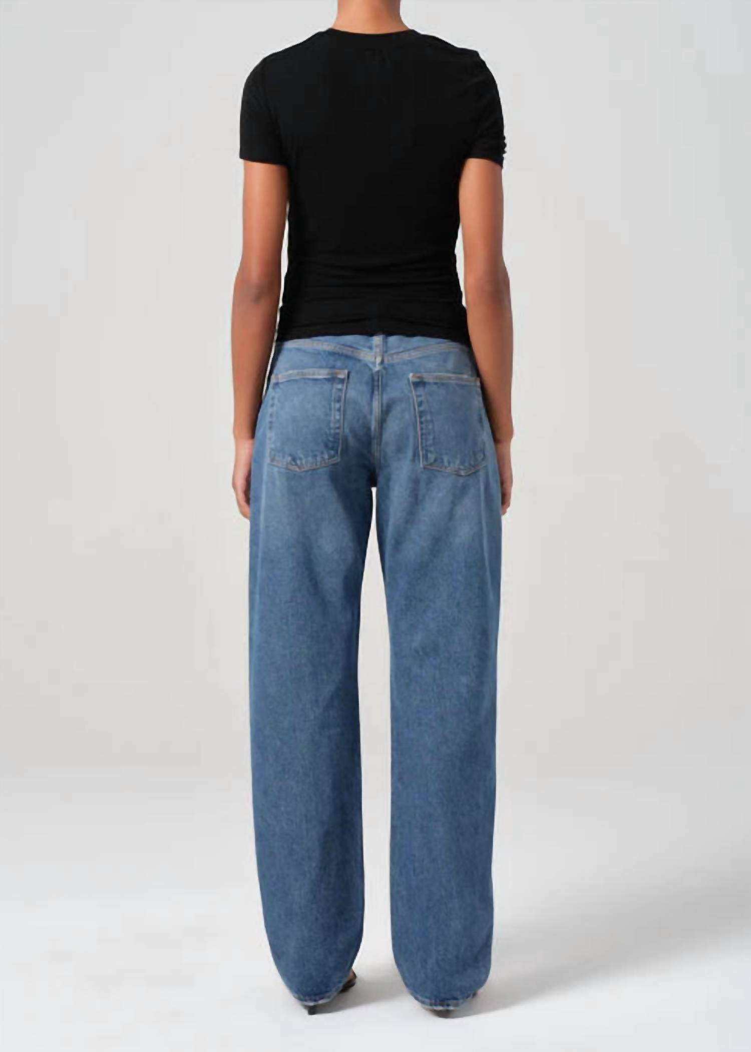 This classic straight leg jean has a perfect fit and goes with just about everything. Embrace timeless elegance with the Kelly Ultra High Waist Straight Leg Jean by AGOLDE in the shade Essence. These jeans boast a high-rise fit with a relaxed top block that transitions into a classic straight leg, complete with an extended inseam of 32". Composed of a sustainable cotton blend—67% organic cotton, 22% recycled lyocell, and 11% post-consumer recycled cotton—they present a striking dark indigo wash with fading and subtle distressing. Closure: Button fly. Crafted in Turkey, these jeans offer a perfect blend of style and eco-conscious appeal. Care: Machine wash cold inside out with like colors, tumble dry low. Model is 5'10" and is wearing a size 27.