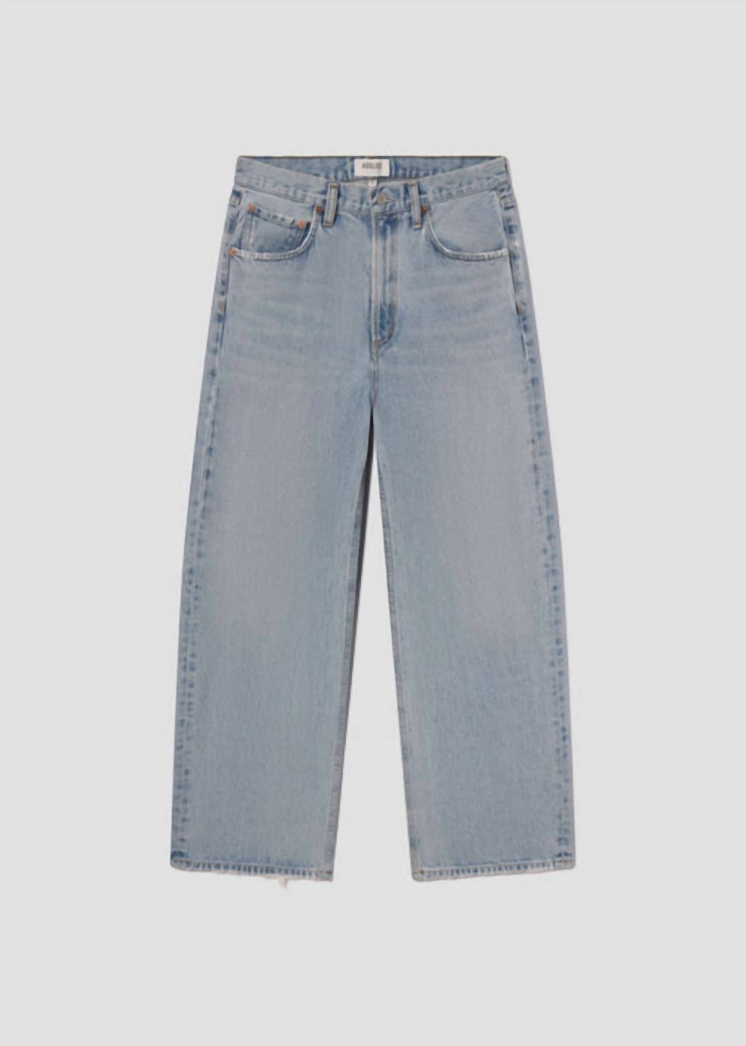 This classic straight leg jean has a perfect fit and goes with just about everything. Discover the AGOLDE Low Curve Jean in Force, an ideal piece for effortless style. This mid-rise jean boasts a relaxed fit with a gently tapered leg, crafted from 100% regenerative cotton in a light wash for that vintage marbled effect. Made in Turkey, it features a zip closure and subtle fading for a worn-in look, with an 11.25" rise, 31" inseam, and 21" leg opening. Care for it by machine washing cold inside out with like colors and tumble drying low. Model is 5'10" and wears a size 27.