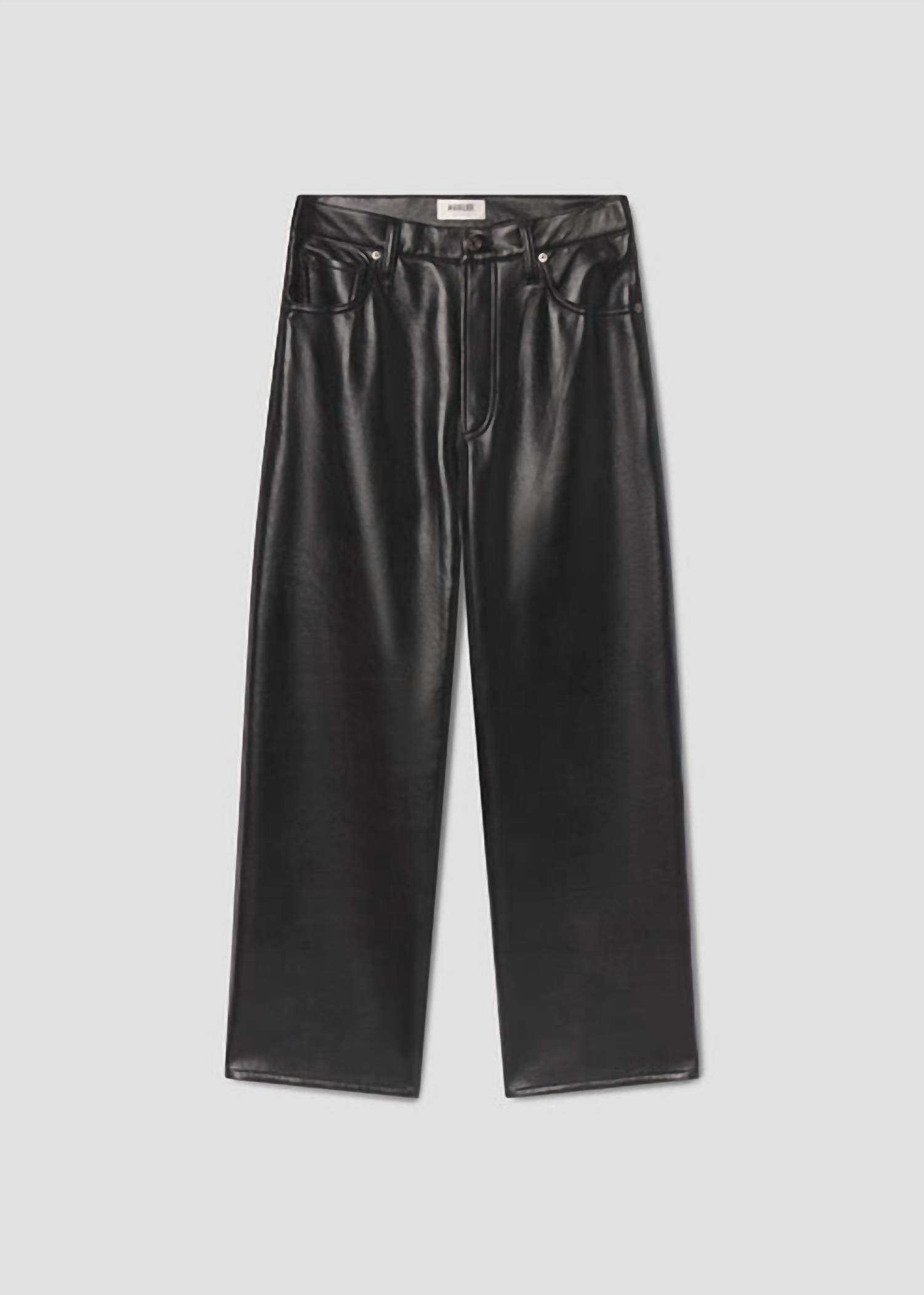 Introducing the Ren Recycled Leather Jean by AGOLDE, a bold statement piece in a sleek Detox shade. These wide-leg, high-rise jeans boast a 12" rise and a 27.5" inseam, ensuring a relaxed fit that's both stylish and comfortable. Crafted from a sustainable blend of 50% recycled leather, 30% polyurethane, 10% viscose, and 10% polyester, they feature a zip closure and are made in the USA with imported materials. Ideal for a holiday party or embracing a preppy trend this spring, they require dry clean only maintenance for best care. Model is 5'10" and wears a size 27, with a leg opening of 19.25".