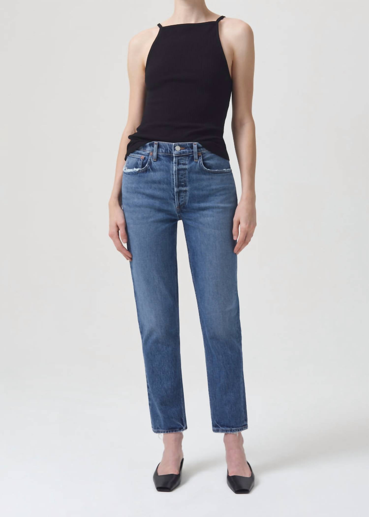 We especially love this cropped jean with a cute pair of slides or sandals. Introducing the AGOLDE Riley Long High Rise Straight Jeans in Moor, perfect for your minimalist summer wardrobe. Crafted from a comfortable cotton blend with 88% Cotton, 11% Recycled Cotton, and 1% Elastane, these jeans boast a flattering high-rise and a regular fit with a skinny leg style. The Riley features a button closure and showcases a medium indigo wash with soft fading, including a 28" inseam and a 14" leg opening. Care for these jeans is simple with machine wash and tumble dry instructions.