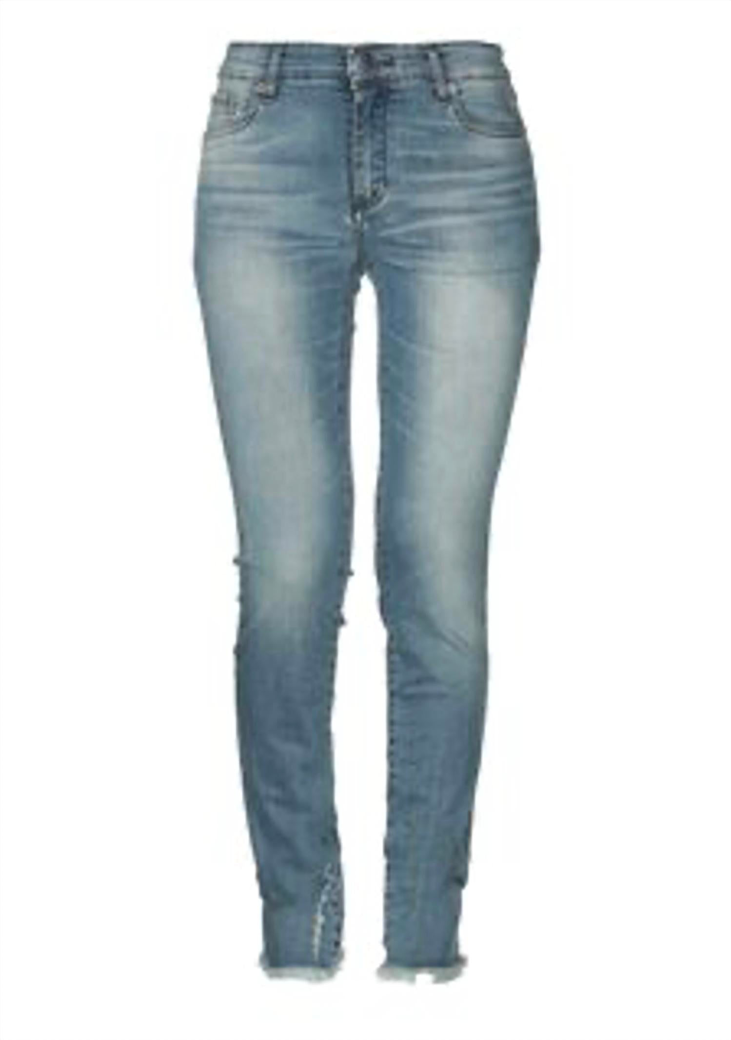 Everyone needs a good pair of skinny jeans and this is a style you'll keep reaching for no matter the season. These slim-fit denim jeans feature a medium wash with a subtly faded finish, adding a worn-in, casual look to the solid color design. They include a classic front closure with a button and zip fastening, along with multiple pockets for practicality. A fringed hem gives the piece a modern, edgy touch, while a visible logo adds a branded accent. Designed with a mid-rise waist and a slight stretch, they offer a comfortable, flattering fit. Made from 90% cotton, 8% polyester, and 2% elastane, they also contain non-textile parts of animal origin, typically found in the branding patch.