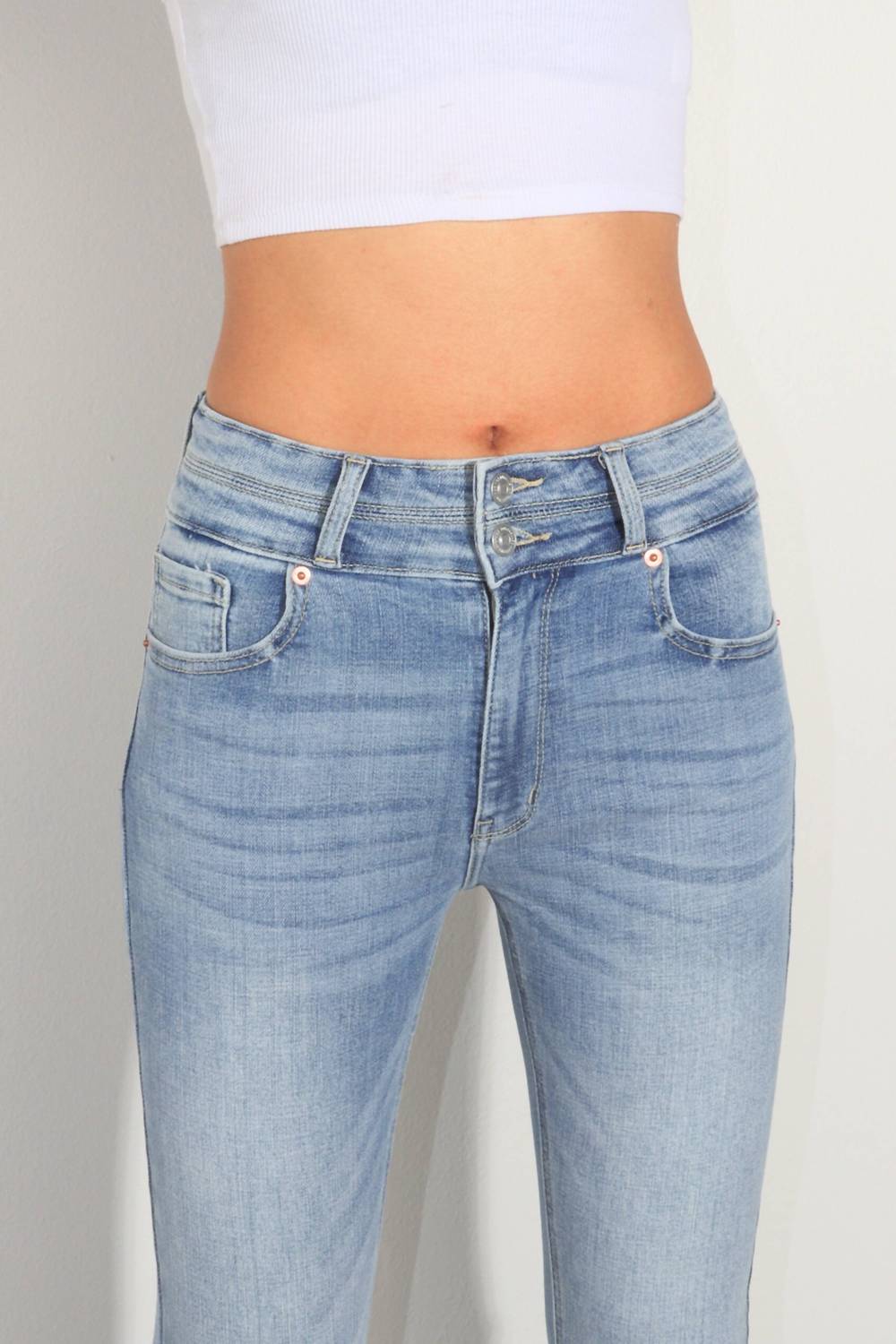 Se você está procurando um jeans boot-cut, este é o jeans para você. Apresentamos a Calça Jeans Feminina Bootcut com Cós Alto e Elástico e Cintura Dupla da Artemis Vintage, projetada para conforto e estilo. Confeccionada em jeans superelástico, esta calça jeans apresenta um corte de cintura alta elegante, cós duplo com fecho de botão. Em lavagem estonada clara, oferece a praticidade de bolsos e uma perna bootcut com cós frontal de 25 cm, costura interna de 81 cm e abertura de 45 cm. Perfeita para um jantar, esta calça combina versatilidade e elegância.