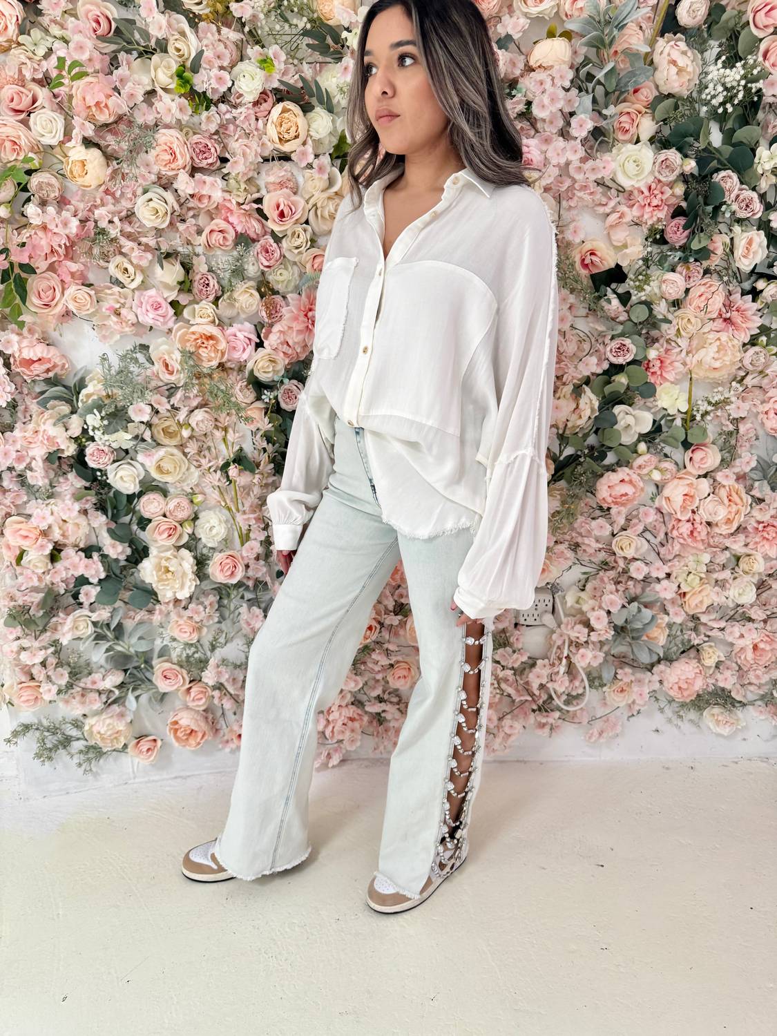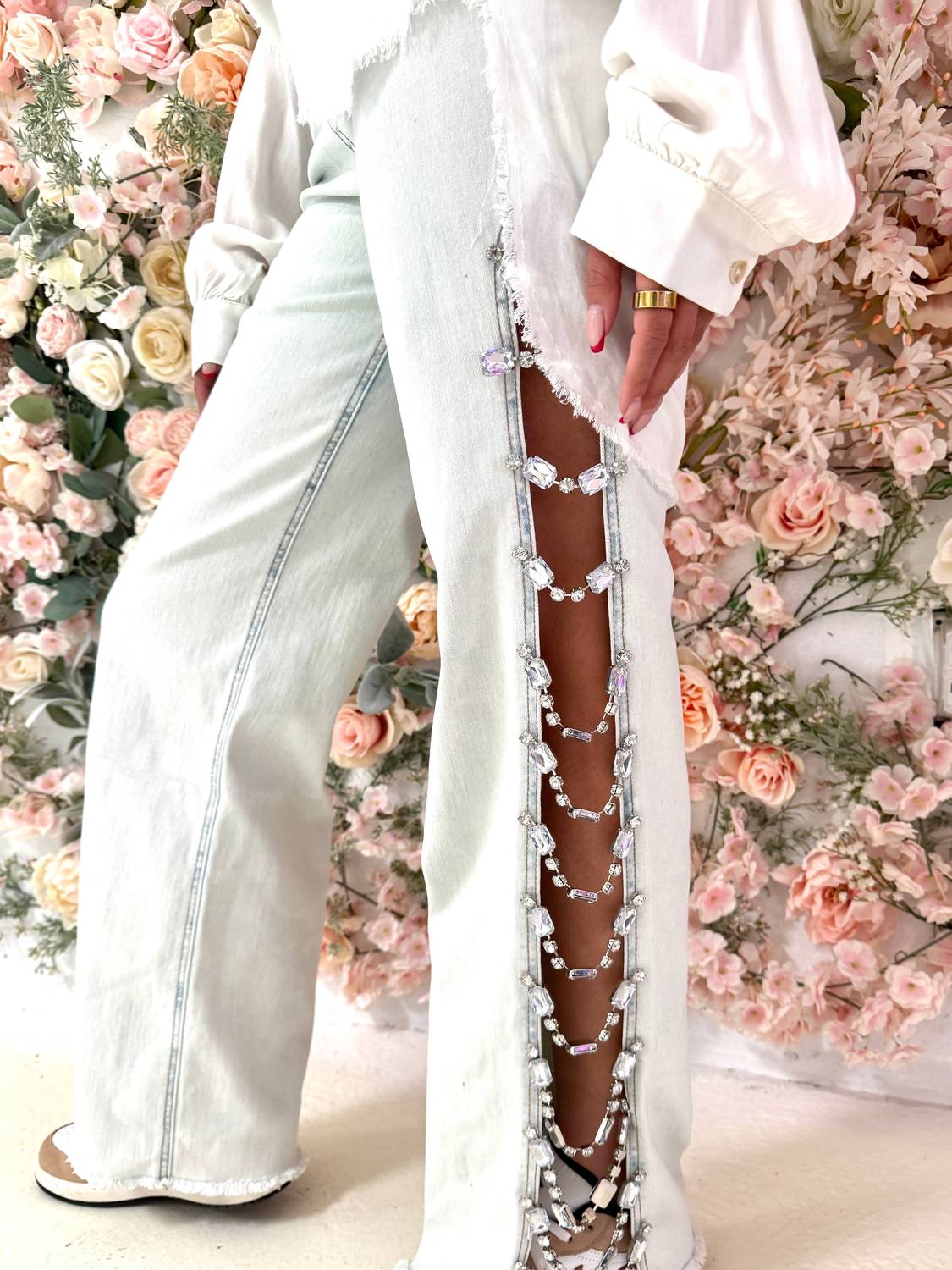Eleve seu guarda-roupa casual com a Calça Jeans Sparkle and Shine da Blue B, confeccionada em lavagem clara, estilo flare contemporâneo e perna larga. Esta calça jeans apresenta um recorte diferenciado, adornado com detalhes em pedraria para um brilho extra. Composta por 78% algodão, 20% poliéster e 2% elastano, ela conta com fecho de zíper para um ajuste seguro. Para melhor conservação, lave à mão e seque no varal para manter seu charme único.