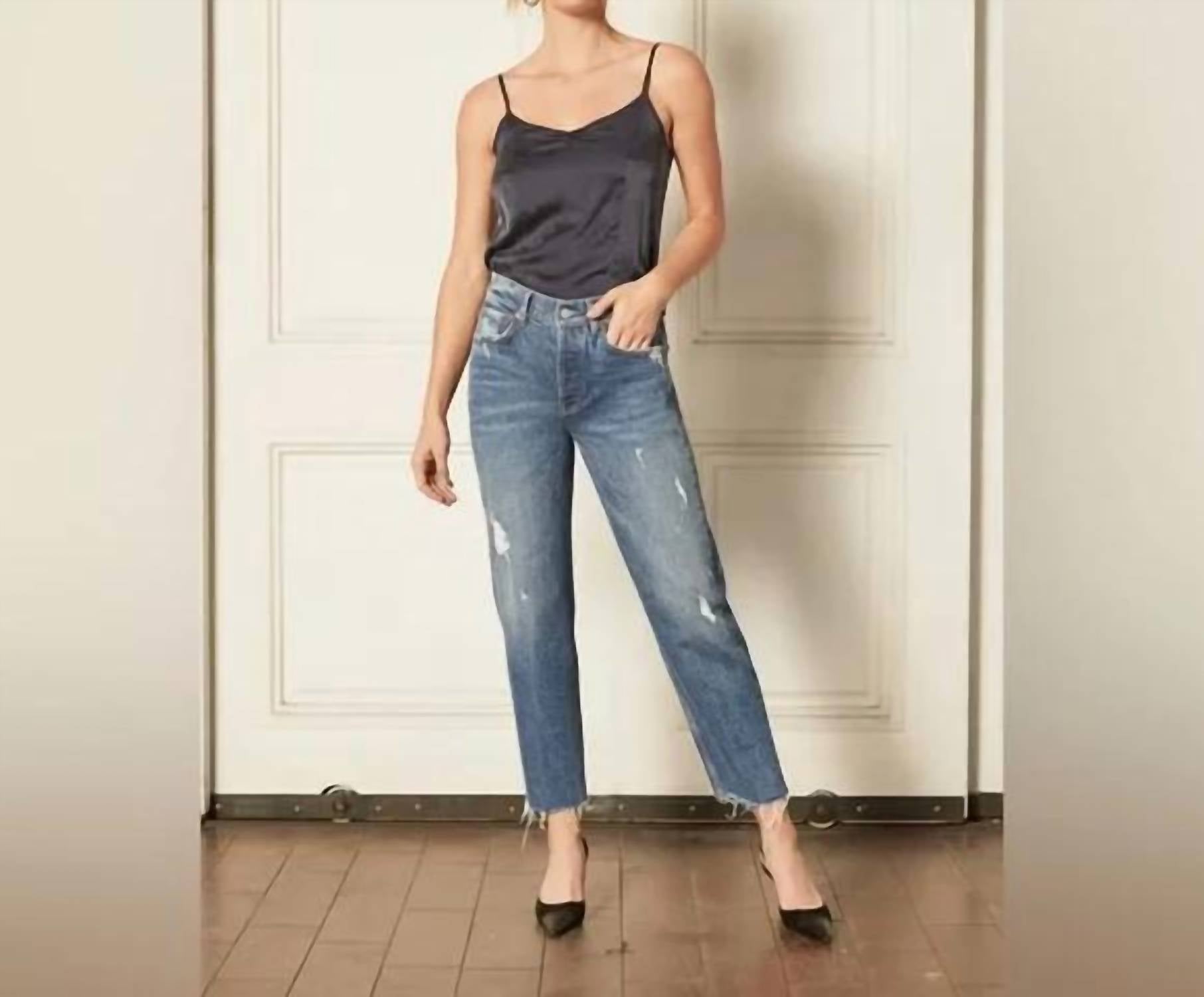 This classic straight jean features a cropped fit with a raw edge hem for a modern, casual finish. Perfect for versatile styling, it offers a timeless silhouette with an updated touch.
