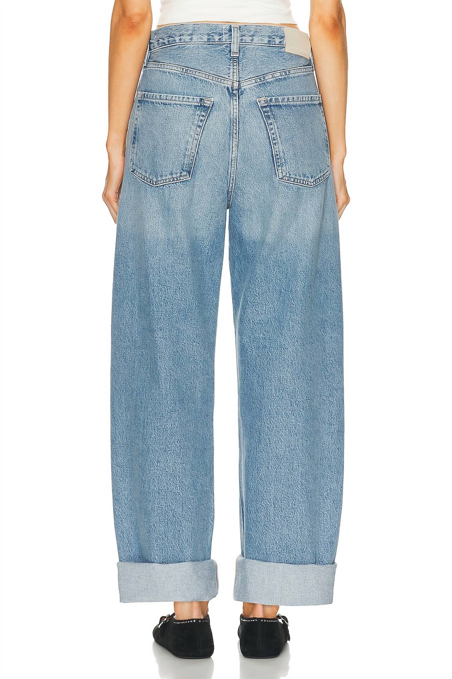 Descubra a Calça Jeans Baggy Ayla da Citizens of Humanity, confeccionada em 100% algodão regenerativo na versátil tonalidade Gemini. Esta calça jeans de perna larga apresenta um caimento relaxado na cintura natural e fecho de botão, com cós alto de 31 cm e uma ampla abertura de 53 cm na perna. Com 81 cm de costura interna, ela foi projetada para um visual confortável e estiloso. O cuidado é fácil com as instruções de lavagem à máquina com água fria do avesso e secagem em temperatura baixa. A modelo tem 1,78 m e veste tamanho 27.