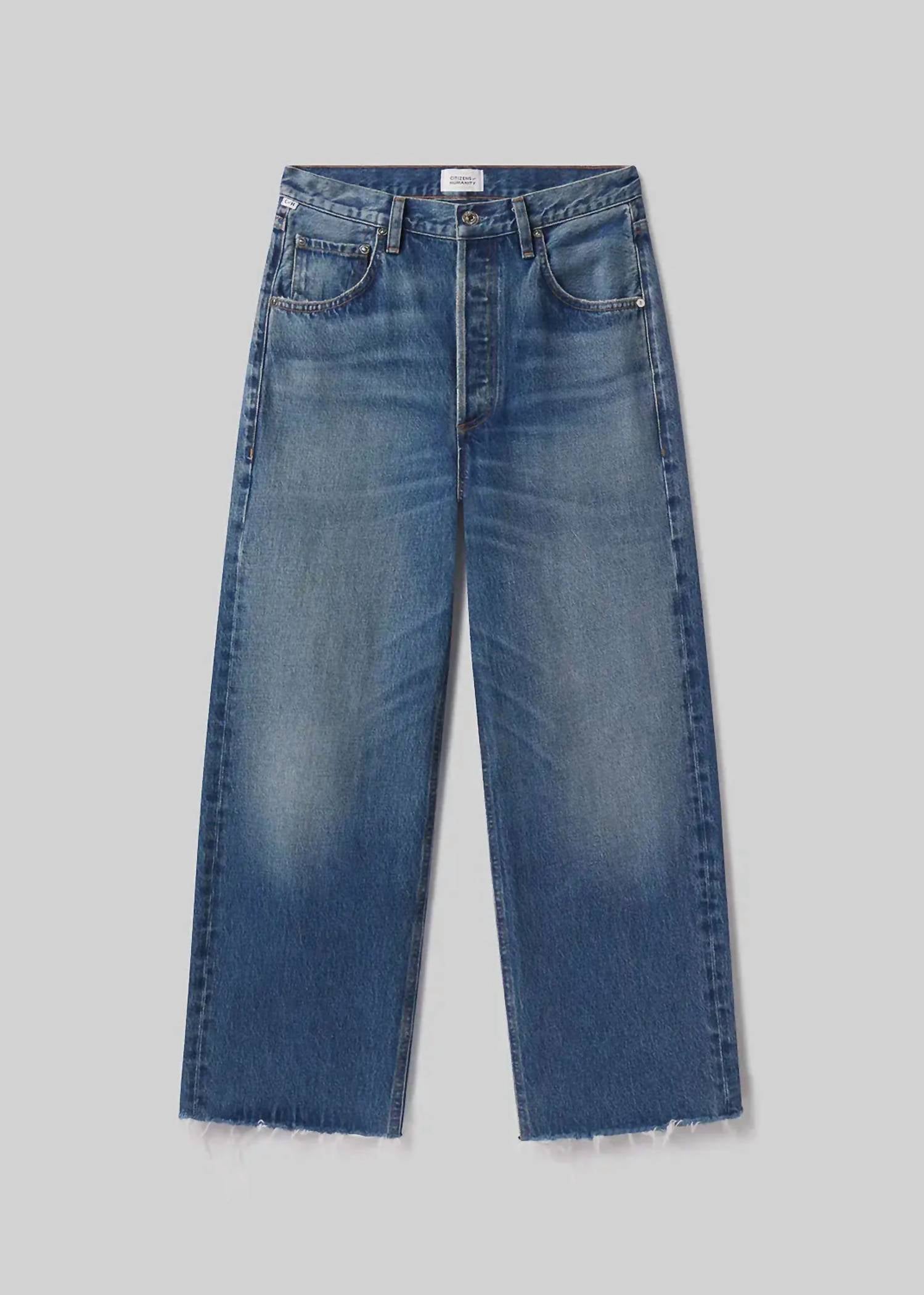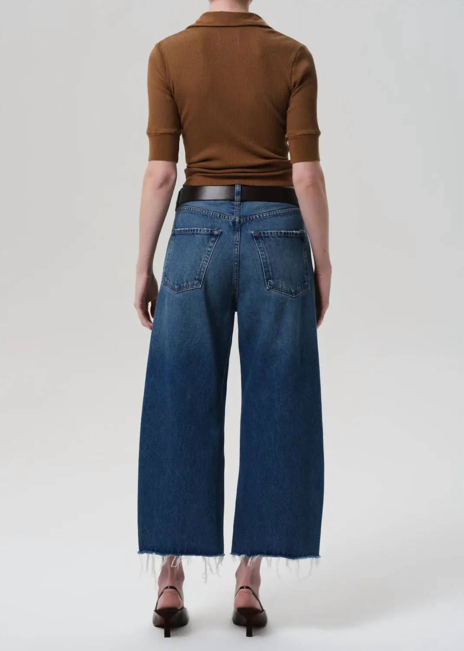 Presenting the Ayla Raw Hem Crop Jeans by Citizens of Humanity, a minimalist statement in women's fashion. With a relaxed wide-leg fit, these jeans feature a cropped 25" inseam and a casual 12.5" rise, perfect for a dinner party or everyday wear. Crafted from 100% regenerative cotton in the Chaya wash, they showcase a medium-light indigo with marbling and a raw hem. Originating from Turkey, the jeans are finished with a button fly closure and can be machine washed cold and tumbled dry on low for easy care. Model is 5'10" and wearing a size 27.