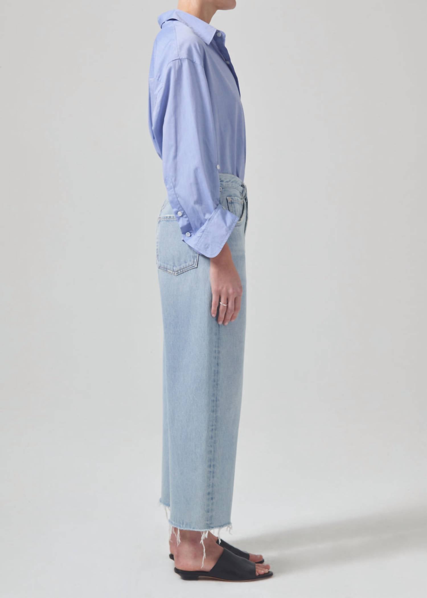 These Ayla Raw Hem Crop Jeans by Citizens of Humanity, crafted from 100% regenerative cotton, offer a lightweight, non-stretch denim feel in a light vintage indigo wash. The design features a relaxed rise, slim fit, and a straight leg with a cropped inseam measuring 25", and a leg opening of 20 3/4", ideal for a modern streetwear style. Closure: Button Fly. Made in the USA with imported materials, care for these jeans by machine washing cold inside out with like colors, without bleach, and tumble dry low.