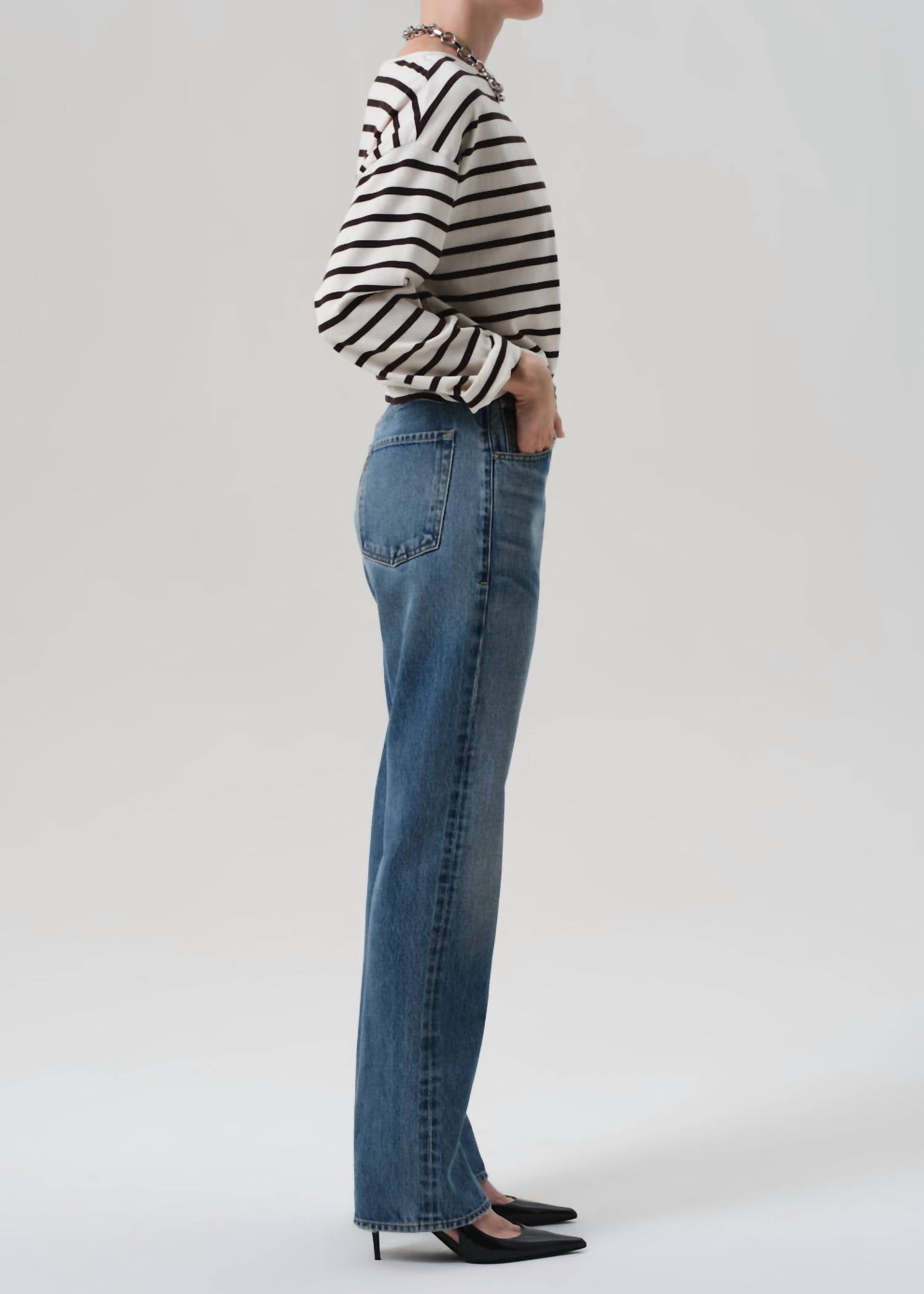 Discover the Baretta Relaxed Straight Jeans by Citizens of Humanity in Babylonia Medium Indigo, perfect for those seeking a timeless vintage look. These high-rise jeans boast a classic straight leg with an elongated 30" inseam and a comfortable 17" leg opening, completed with a button fly closure. Crafted from 100% regenerative cotton, they provide a non-stretch, rigid feel with a hint of texturing and delicate fading. Care for these stylish bottoms is a breeze—simply machine wash and tumble dry, making them a reliable choice for any summer ensemble.