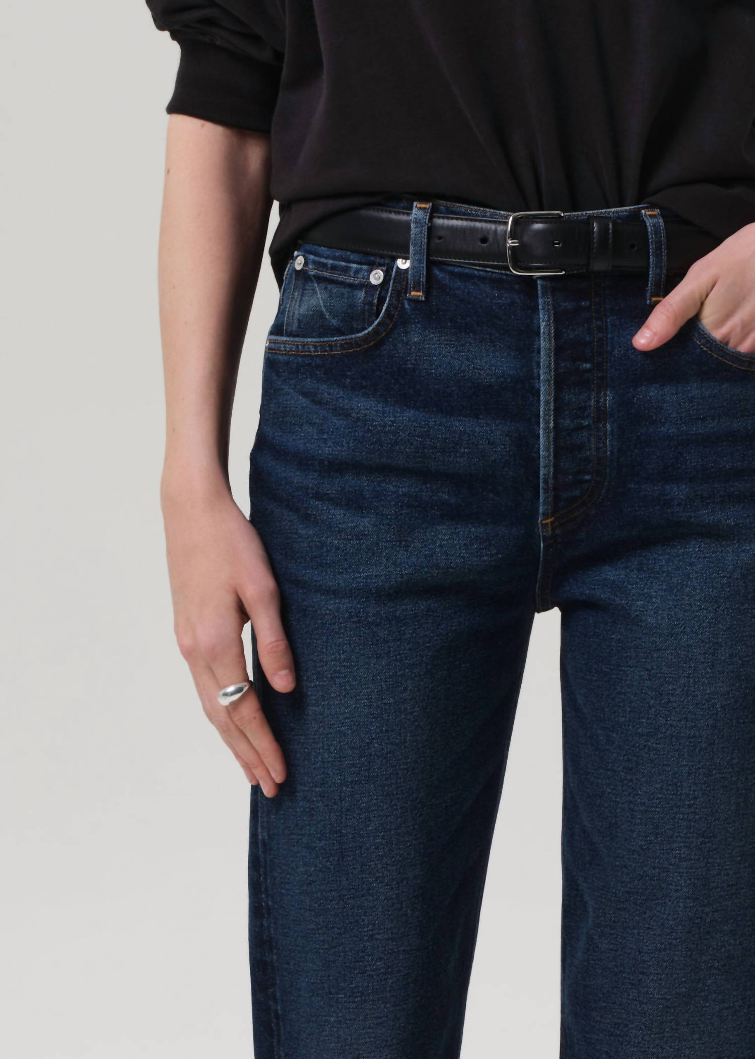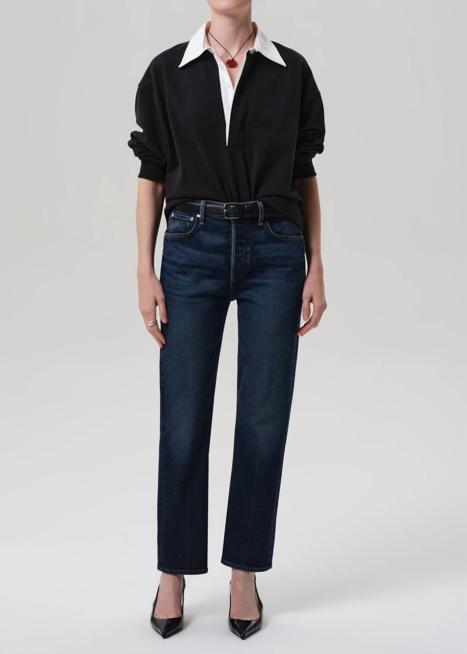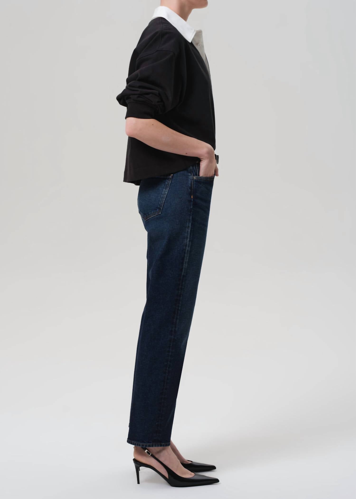 The Blaine High Rise Straight Leg Jeans by Citizens of Humanity effortlessly blend vintage charm with modern silhouettes, designed in Sutherland's rich dark indigo wash with subtle fading for versatility. These jeans are crafted from 98% cotton and 2% polyurethane Japanese comfort stretch denim, ensuring both softness and a structured fit, featuring a high-rise waist and ankle-grazing length. Closure is achieved with a button fly, and the details include a rise of 11.5 inches, an inseam of 29 inches, and a leg opening of 15.25 inches, complementing its relaxed yet polished vibe. Ideal for travel or casual outings, maintain these jeans with ease through machine wash care. Model is 5'10" and wears size 27.