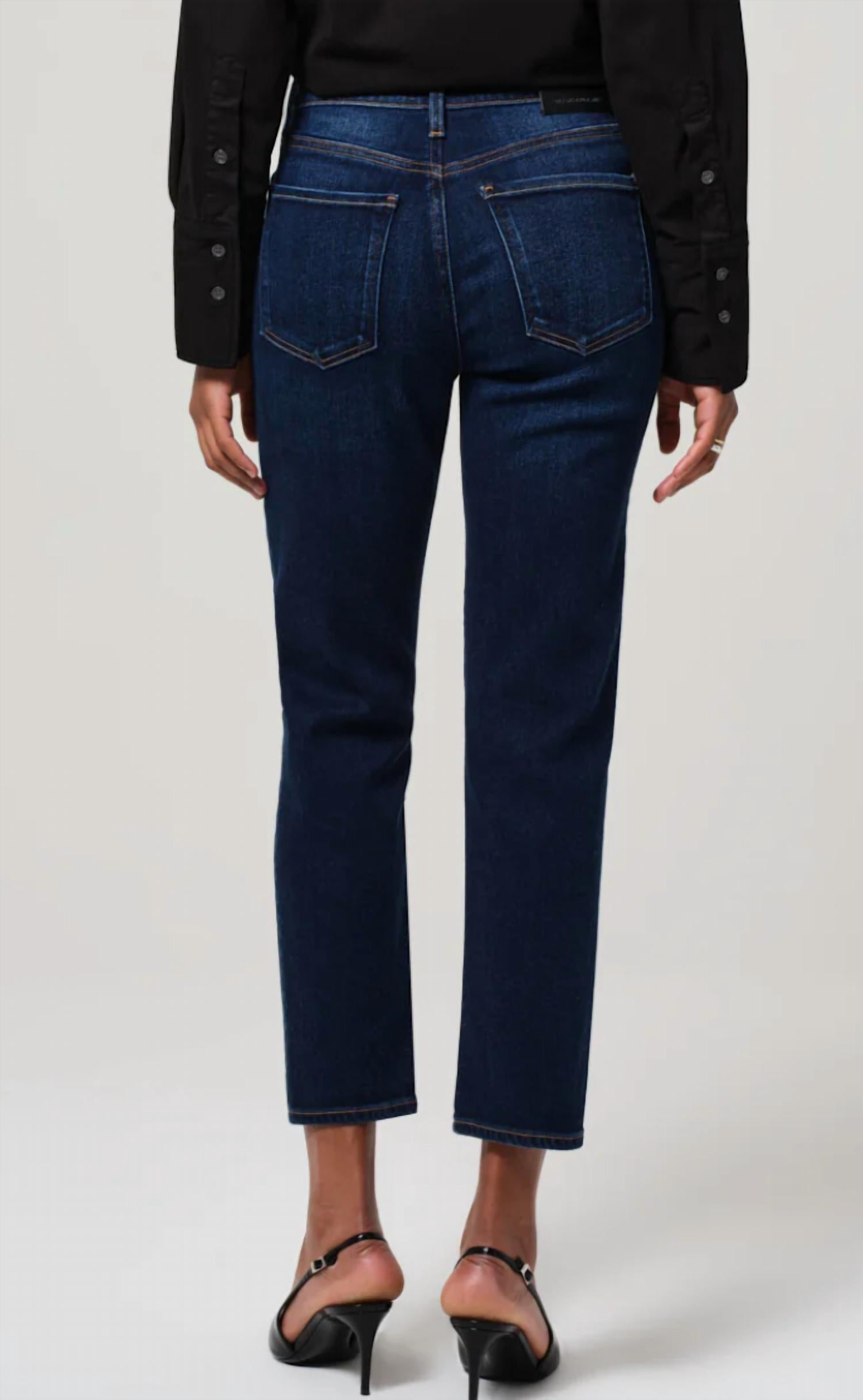 Nós amamos especialmente esse jeans curto com um lindo par de chinelos ou sandálias. Apresentamos a calça jeans reta Caia da Citizens of Humanity, confeccionada para uma silhueta elegante com perna reta, cintura alta e justa, em uma lavagem índigo escura com ondulações e desbotamento. Parte da coleção Soft Stretch, esta calça jeans oferece maciez excepcional e fixação duradoura. Possui fecho de botão e caimento fiel ao tamanho, com a modelo vestindo tamanho 27 e medindo 1,78 m. O cuidado é fácil, com instruções de lavagem à máquina e secagem no varal. A modelo tem 1,78 m e veste tamanho 27.