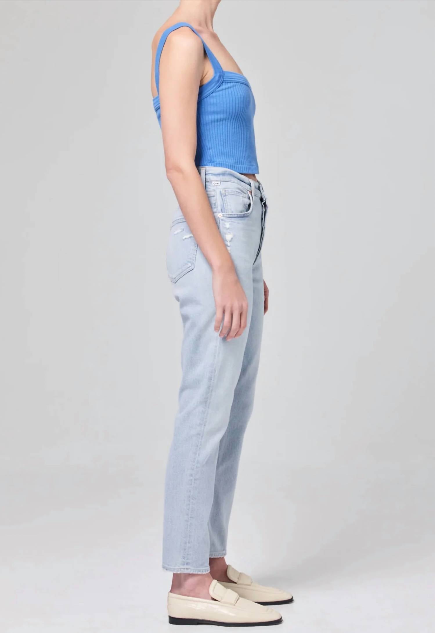Discover the Jolene High Rise Straight Jean by Citizens of Humanity, expertly crafted to offer a flattering fit. With a high-rise design at 11.5 inches and a sleek 27-inch inseam, this jean provides a contoured, yet comfortable experience. Its composition of 59% organic cotton, 40% Ecovero viscose, and 1% elastane ensures both sustainability and slight stretch. The button fly closure adds a classic touch, while the light indigo hue perfectly complements any outfit, from sneakers to ankle boots. Care: Machine wash and line dry. Model is 5'10" and wears a size 27.