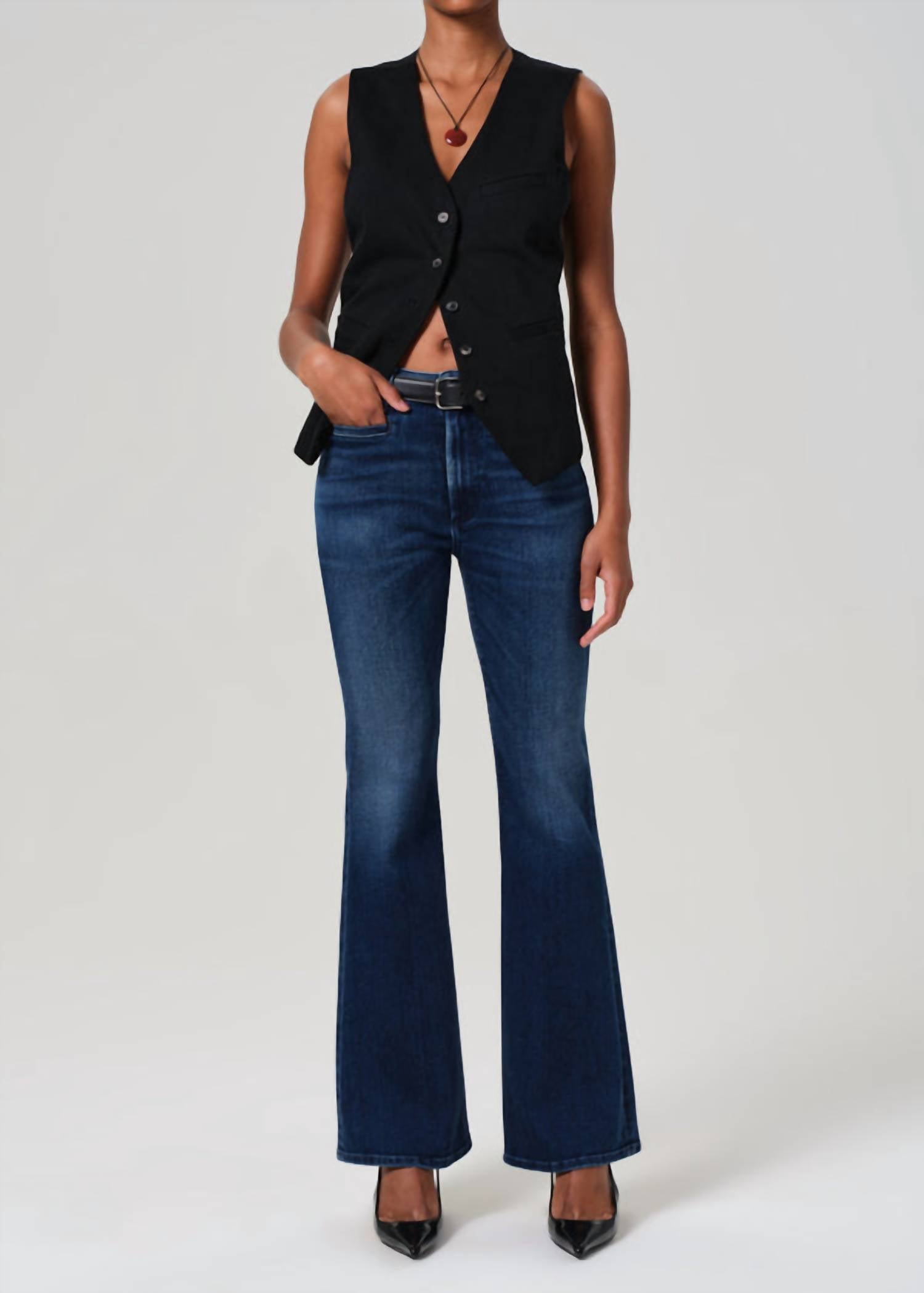 Tão fofos quanto confortáveis. Apresentamos a calça jeans flare Lilah da Citizens of Humanity, uma homenagem chique ao glamour dos anos 70. Com um caimento confortável, esta calça jeans é confeccionada com uma perna flare que valoriza o corpo, estampa lisa e bolsos funcionais. Confeccionada em uma mistura de algodão premium com 81% algodão, 11% liocel, 9% poliéster e 2% elastano, ela apresenta 28 cm de altura e 82 cm de costura interna, proporcionando uma silhueta que alonga as pernas. Fechamento: O fecho por botão garante um ajuste seguro, combinando perfeitamente com uma blusa folgada e botas de couro.