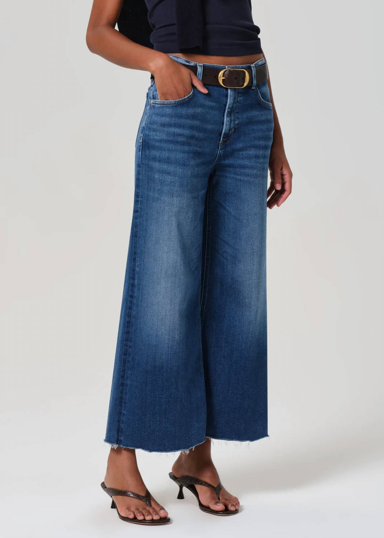 O Lyra é um modelo de silhueta inspirada no vintage que fica alto na cintura, com um corte superior fácil e relaxado, com costura interna curta e bainha crua volumosa e perna larga.