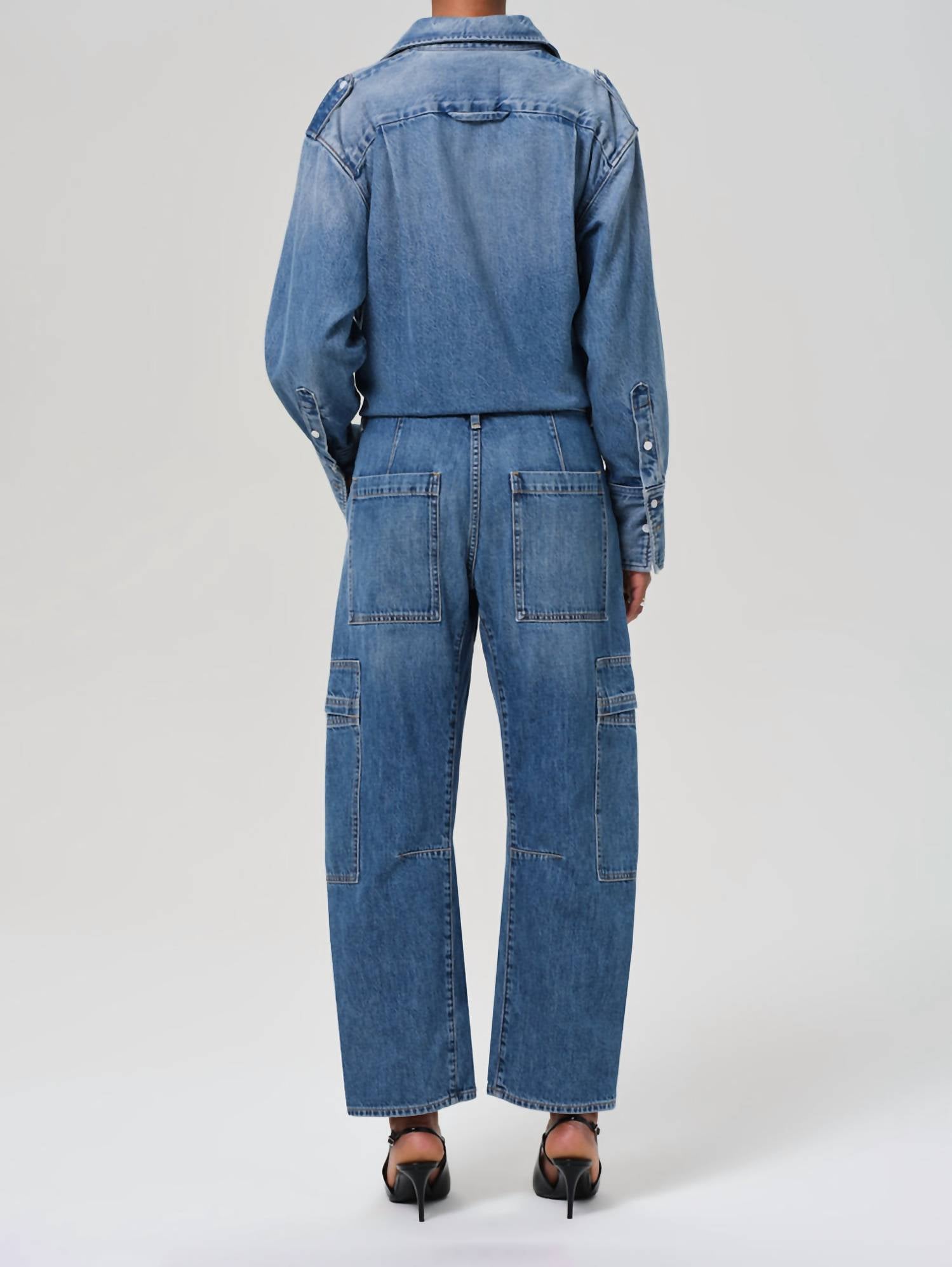 A flattering silhouette that's suprisingly versatile. Introducing the Marcelle Low Slung Cargo Jean by Citizens of Humanity, a stylish staple in Elysian medium blue wash perfect for any holiday party. Made from 100% regenerative cotton, these wide-leg jeans feature a low-slung waist, relaxed fit, and distinctive cargo and trouser-style pockets. With a front rise of 11.75 inches, an inseam of 27.5 inches, and a leg opening of 17.75 inches, these jeans offer both comfort and trend-right appeal. Closure: Zip closure. Care: Machine wash cold inside out with like colors, do not bleach, tumble dry low. Imported from Turkey.