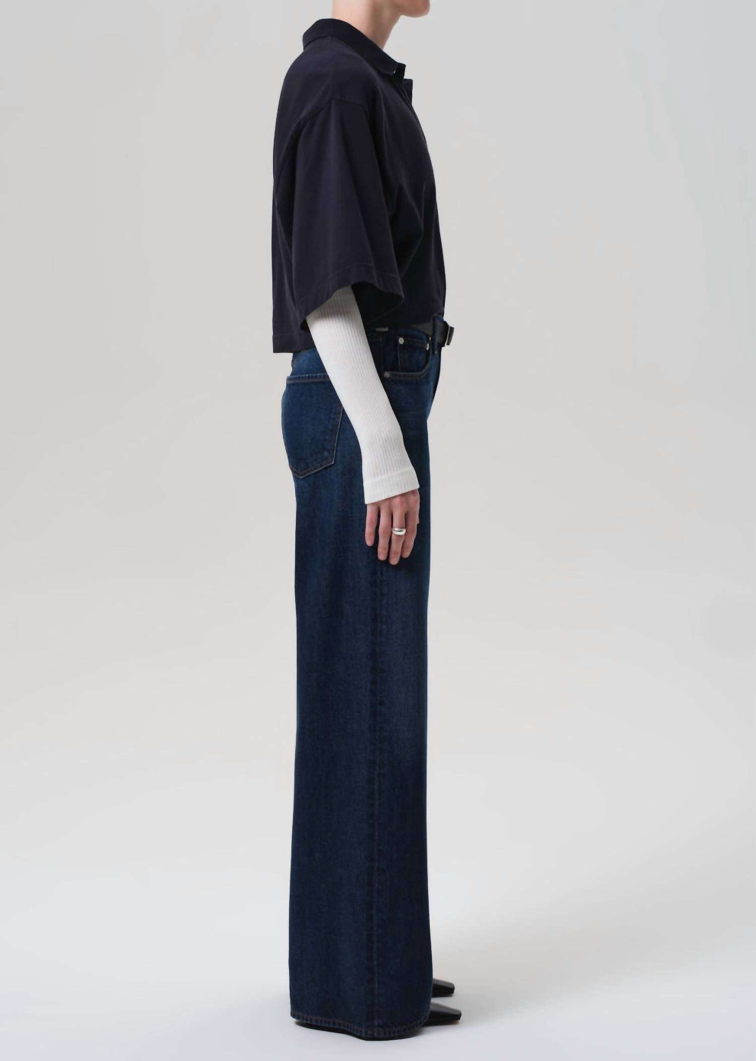 Just as cute as they are comfortable. Introducing the Paloma Baggy Jean by Citizens of Humanity, a stylish choice for the spring season with its preppy, relaxed fit, and wide leg style. Made in Turkey, these jeans offer a high rise of 11 3/4" and feature a dark wash in the appealing shade of Gamut. The fabric is a sustainable blend of 70% Lyocell and 30% pre-consumer recycled cotton, finished with a convenient zip fly closure. With an inseam of 32", care is easy—machine wash cold inside out with like colors, tumble dry low, and do not bleach. Model is 5'10" and wearing a size 27.