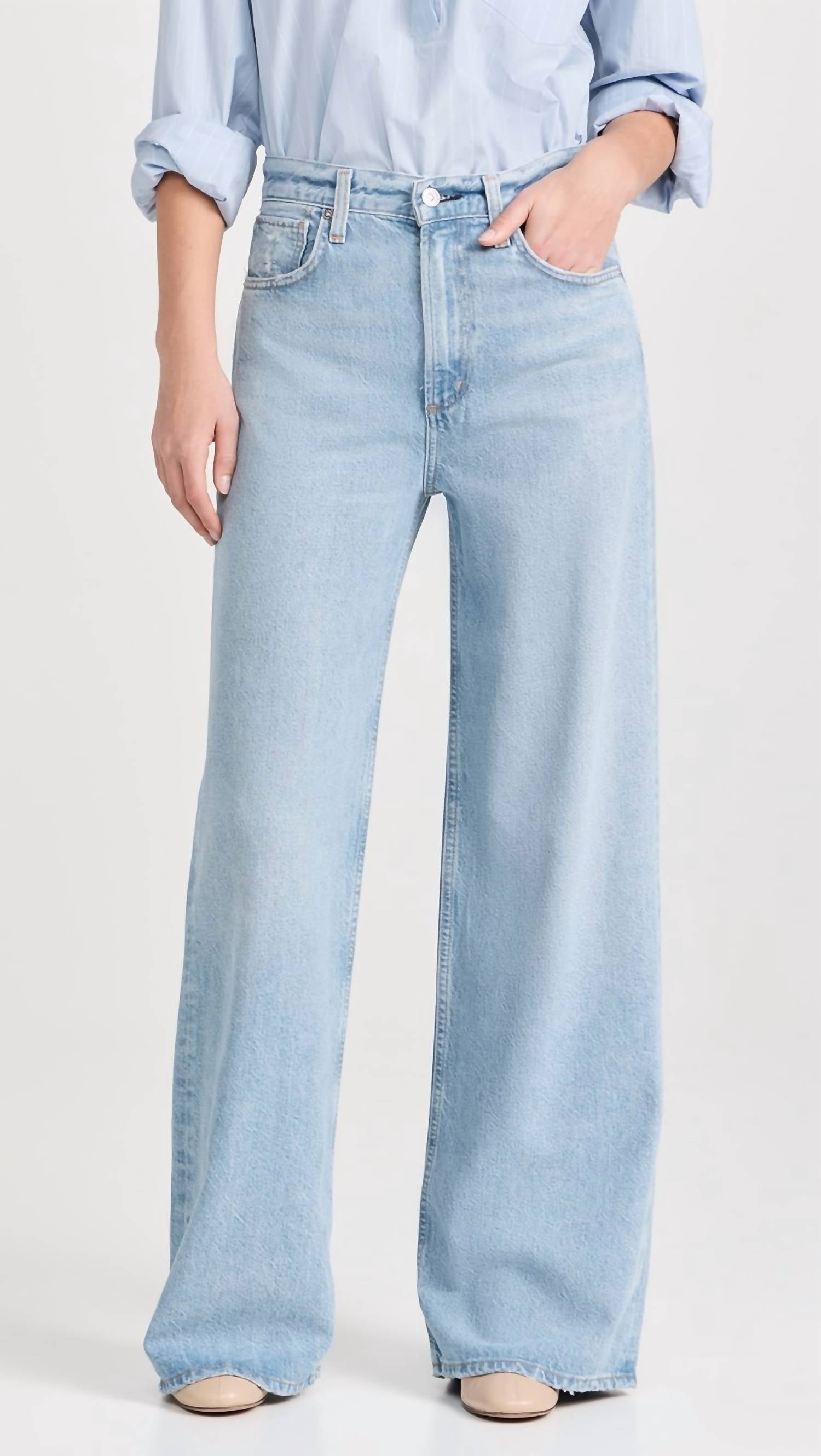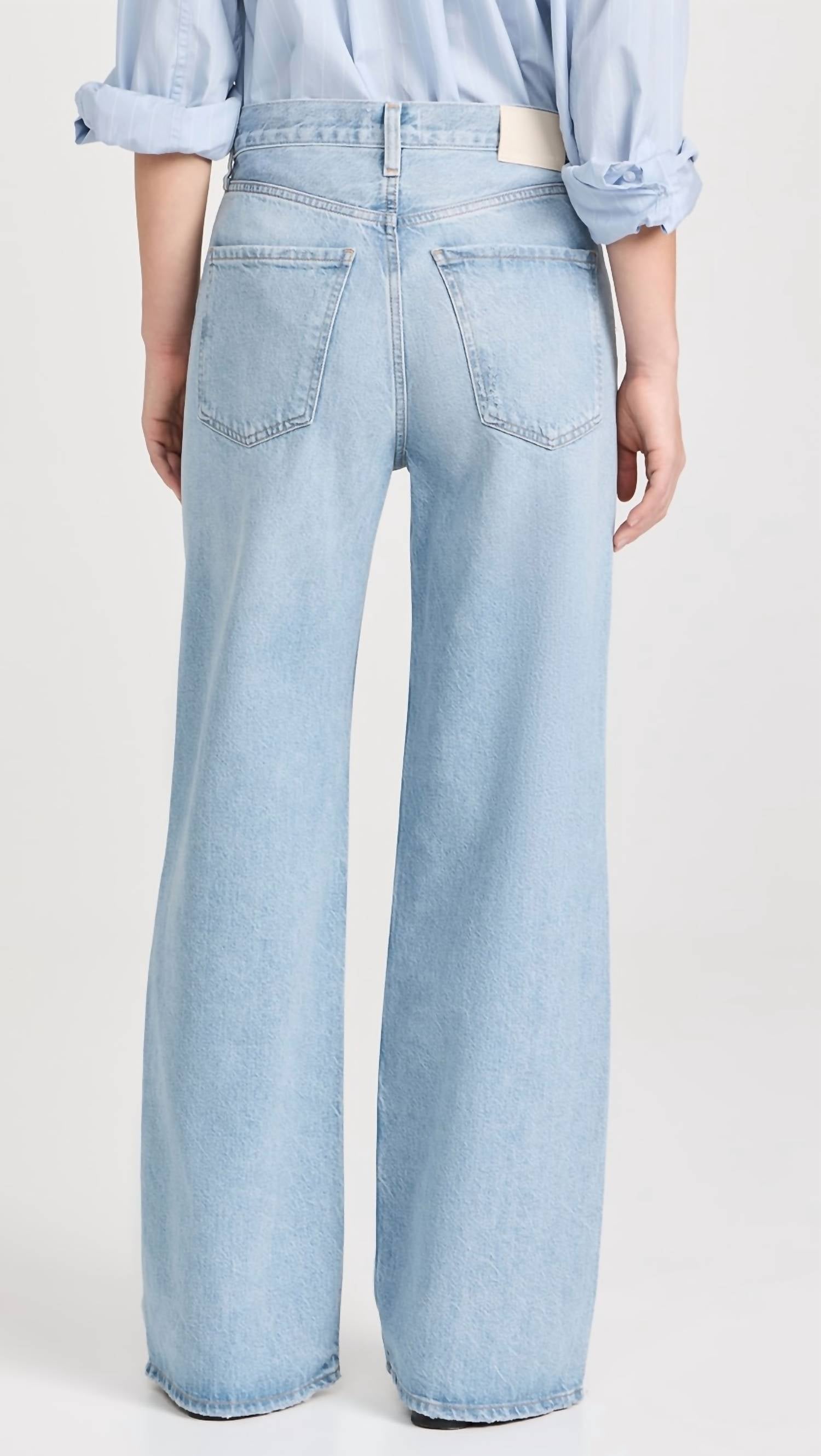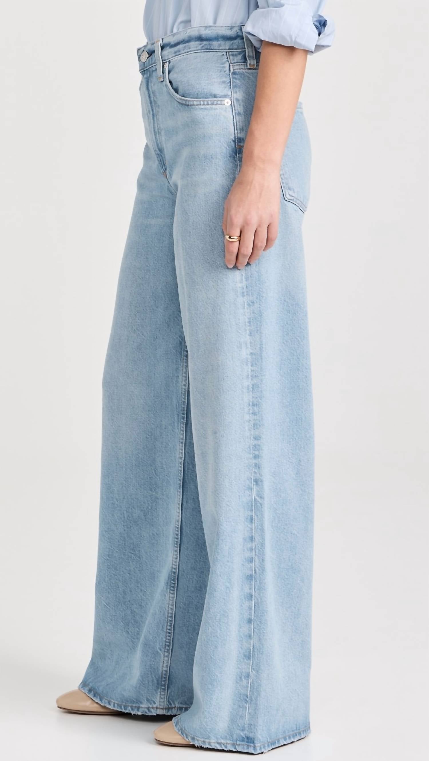 Introducing the Paloma Baggy Jeans by Citizens of Humanity, a striking pair of wide-leg denim in the color Alemayde perfect for embracing the 90s fashion trend. With a high rise of 12 inches and an inseam of 32 inches, these jeans offer a relaxed fit and vintage detailing. Crafted from a blend of 70% Lyocell and 30% pre-consumer recycled cotton, they provide a rigid feel with a soft hand. Closure: Zip fly. Care: Machine wash cold inside out with like colors, do not bleach, tumble dry low. Model is 5'10" and wears size 27.