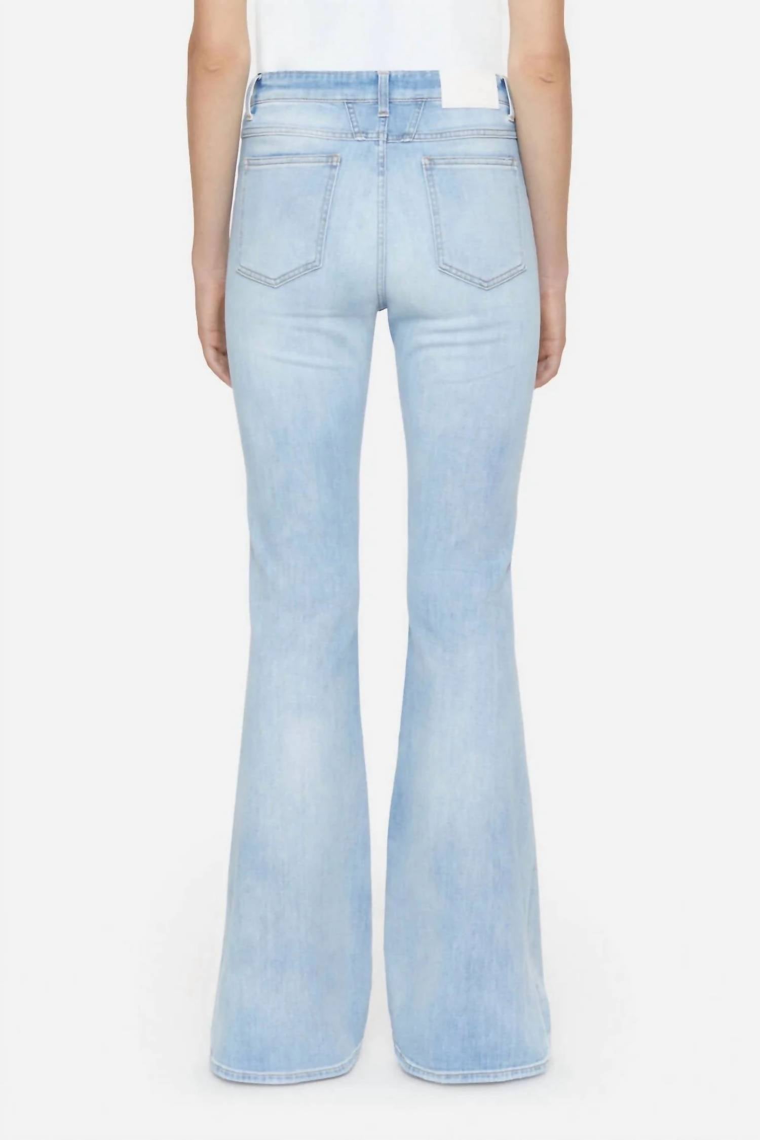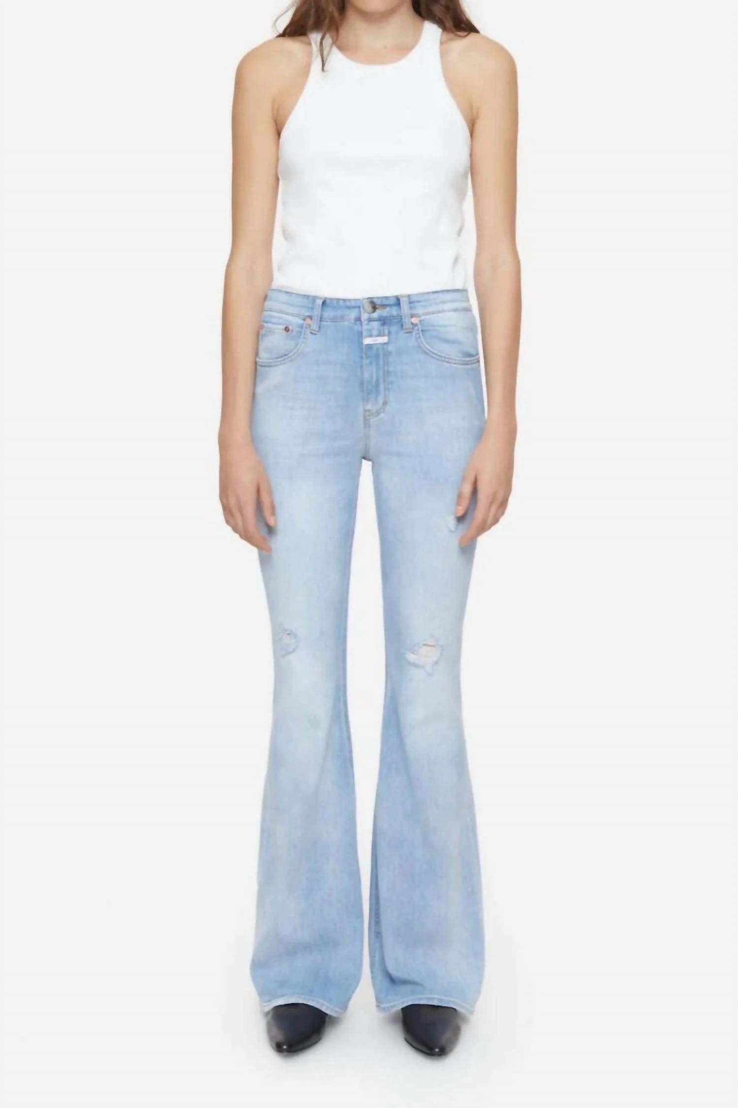 Introducing the Women's Rawlin Jeans by CLOSED—a fusion of style and sustainability. Crafted in Italy from light stretch denim (10 oz.) by Candiani, these light blue jeans feature a high waist and a flared leg, offering a classic fit. The zip closure ensures a sleek silhouette, while pockets add practicality. Embrace eco-friendly fashion with this piece from the A BETTER BLUE line, ideal for spring streetwear and vacation looks.