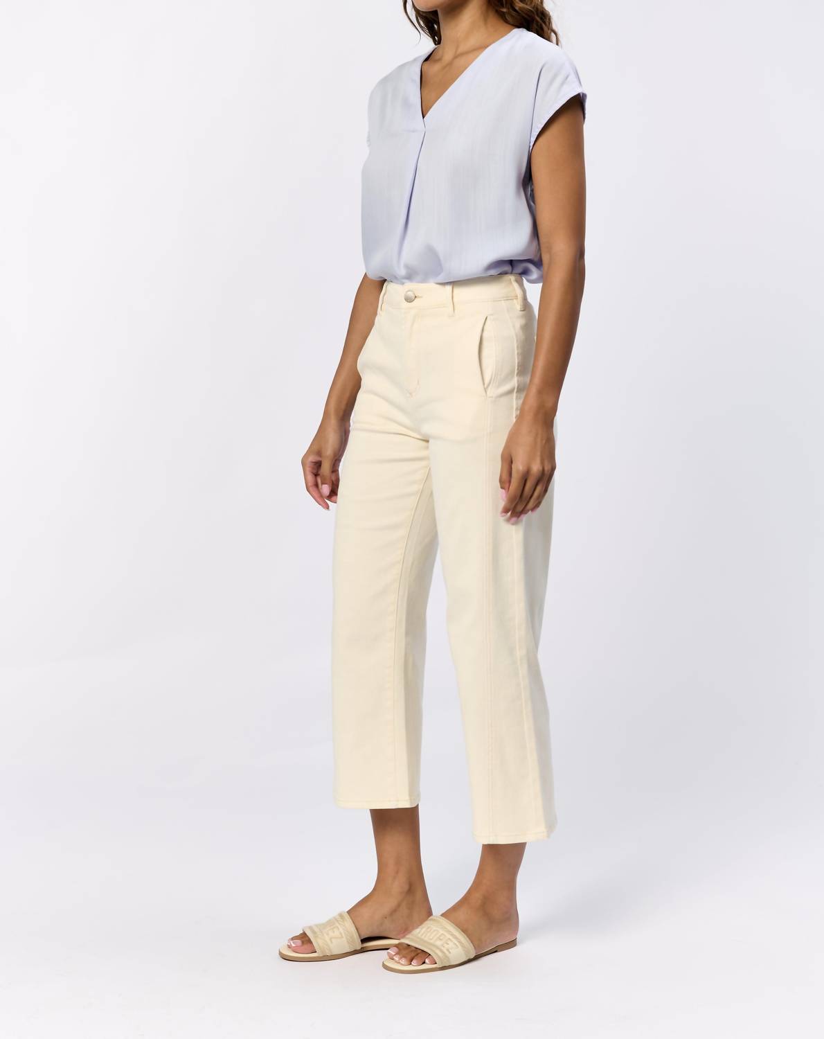 A flattering silhouette that's suprisingly versatile. Experience the Audrey Wide Leg Jean by DEAR JOHN DENIM, crafted in a stylish Wheat hue perfect for any occasion. These jeans are made with a premium cotton blend of 97% cotton and 3% spandex, ensuring a relaxed fit and ultimate comfort with a high rise of 12.5 inches and an inseam of 25 inches. Featuring a flattering wide leg style and solid pattern, they provide a polished look that transitions effortlessly from day to night. Closure: Button closure. Care: Machine wash, tumble dry.