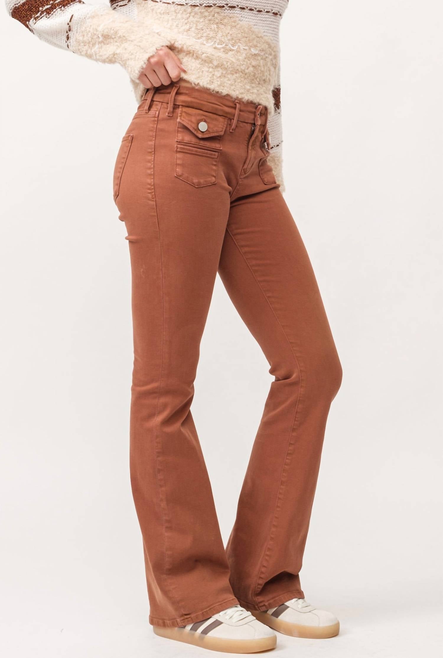 Fique na moda com estas calças boot cut estilosas e com caimento perfeito. A combinação perfeita de conforto e estilo, você vai querer usá-las a estação toda! Eleve sua coleção de jeans com a calça jeans Jaxtyn Bootcut da Dear John Denim, que oferece um toque sofisticado em um deslumbrante tom Burnt Sienna. Esta calça jeans apresenta um corte bootcut elegante com cintura alta, além de um caimento relaxado, estiloso e confortável. A estampa sólida e o design de perna larga adicionam um toque de elegância, enquanto os bolsos práticos aprimoram a funcionalidade. Esta calça jeans, com fecho de botão confiável, é fácil de cuidar; basta lavar na máquina e secar no varal para obter melhores resultados.